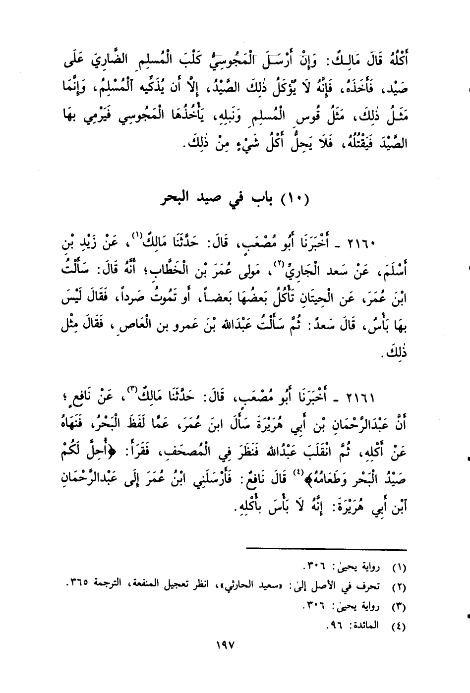 ٢١٦٠ - أَخْبَرَنَا أَبُو مُصْعَبٍ، قَالَ: حَدَّثَنَا مَالِكٌ، عَنْ زَيْدِ بْنِ أَسْلَمَ، عَنْ سَعْدٍ الْجَارِيِّ، مَوْلَى عُمَرَ بْنِ الْخَطَّابِ , أَنَّهُ قَالَ: سَأَلْتُ ابْنَ عُمَرَ عَنِ الْحِيتَانِ تأكلُ بَعْضُهَا بَعْضًا , أَوْ تَمُوتُ صَرَدًا؟ فَقَالَ لَيْسَ بِهَا بَأْسٌ، قَالَ سَعْدٌ: ثُمَّ سَأَلْتُ عَبْدَ اللهِ بْنَ عَمْرِو بْنِ الْعَاصِ , فَقَالَ مِثْلَ ذَلِكَ.
