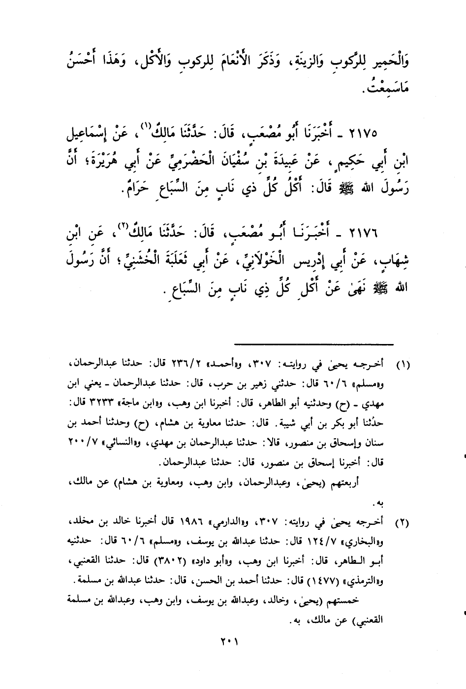 ٢١٧٥ - أَخْبَرَنَا أَبُو مُصْعَبٍ، قَالَ: حَدَّثَنَا مَالِكٌ، عَنْ إِسْماَعِيلَ بْنِ أَبِي حَكِيمٍ، عَنْ عَبِيدَةَ بْنِ سُفْيَانَ الْحَضْرَمِيِّ، عَنْ أَبِي هُرَيْرَةَ، أَنَّ رَسُولَ اللَّهِ صَلى الله عَلَيه وَسَلم، قَالَ: أَكْلُ كُلِّ ذِي نَابٍ مِنَ السِّبَاعِ، حَرَامٌ.