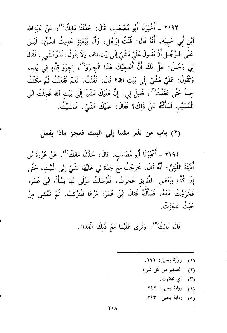 ٢١٩٣ - أَخْبَرَنَا أَبُو مُصْعَبٍ، قَالَ: حَدَّثَنَا مَالِكٌ، عَنْ عَبْدِ اللهِ بْنِ أَبِي حَبِيبَةَ، قَالَ: قُلْتُ لِرَجُلٍ، وَأَنَا يَوْمَئِذٍ حَدِيثُ السِّنِّ: ليس عَلَى الرَّجُلِ أَنْ يَقُولَ عَلَيَّ مَشْيٌ إِلَى بَيْتِ اللهِ، وَلايَقُولْ نَذْرُ مَشْيٍ، فَقَالَ لِي رَجُلٌ: هَلْ لَكَ أَنْ أُعْطِيَكَ هَذَا الْجِرْوَ، لِجِرْوِ قِثَّاءٍ فِي يَدِهِ، وَتَقُولُ: عَلَيَّ مَشْيٌ إِلَى بَيْتِ اللهِ؟ قَالَ: فَقُلْتُ: نَعَمْ، فَفلْتُ , ثُمَّ مَكَثْتُ حيناً حَتَّى عَقَلْتُ، فَقِيلَ لِي: إِنَّ عَلَيْكَ مَشْيًا إلى بيت الله، فَجِئْتُ ابْنَ الْمُسَيَّبِ , فَسَأَلْتُهُ عَنْ ذَلِكَ؟ فَقَالَ: عَلَيْكَ مَشْيٌ , فَمَشَيْتُ.