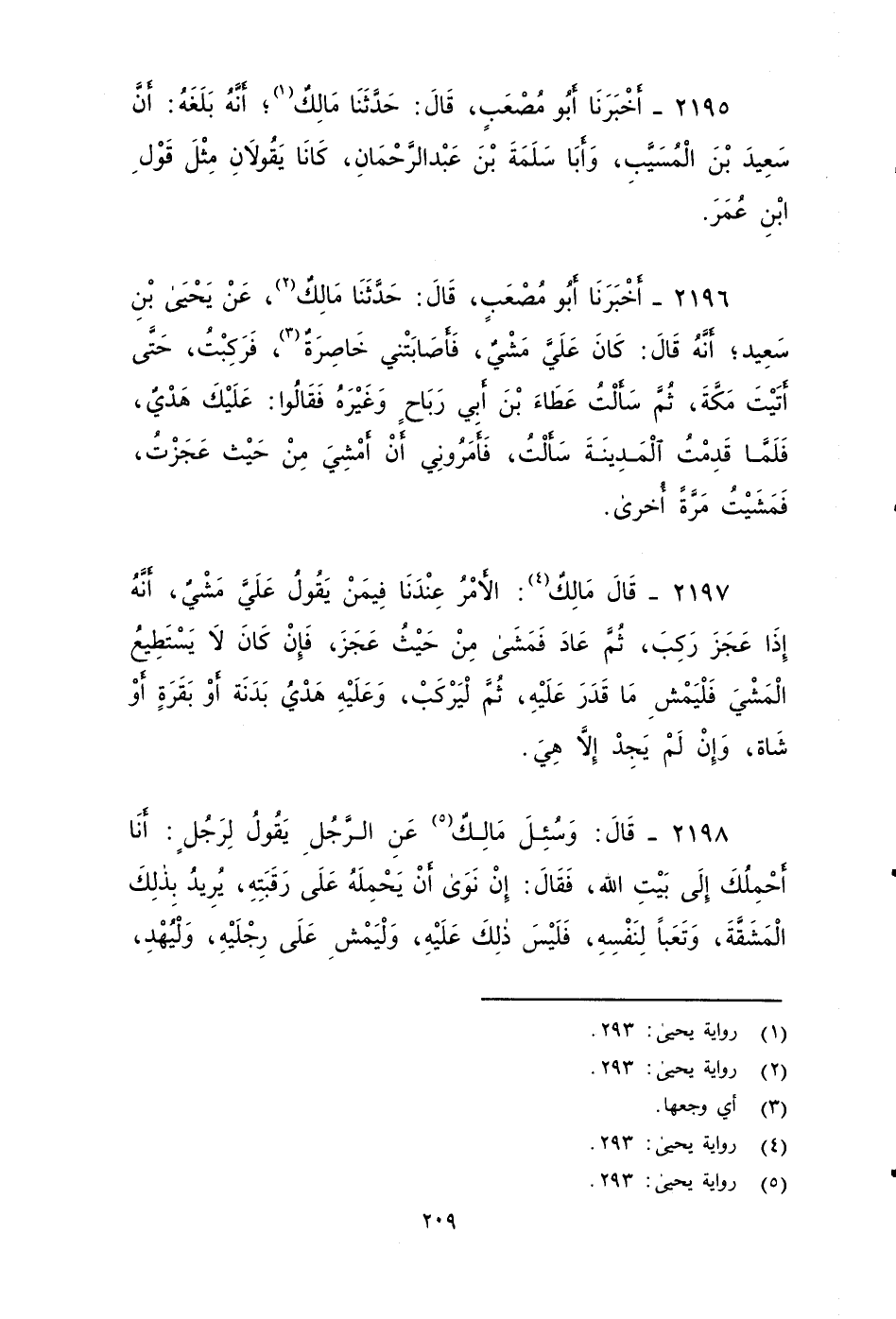 ٢١٩٦ - أَخْبَرَنَا أَبُو مُصْعَبٍ، قَالَ: حَدَّثَنَا مَالِكٌ، عَنْ يَحْيَى بْنِ سَعِيدٍ، أَنَّهُ قَالَ: كَانَ عَلَيَّ مَشْيٌ , فَأَصَابَتْنِي خَاصِرَةٌ، فَرَكِبْتُ حَتَّى أَتَيْتُ مَكَّةَ، ثم سَأَلْتُ عَطَاءَ بْنَ أَبِي رَبَاحٍ وَغَيْرَهُ فَقَالُوا: عَلَيْكَ هَدْيٌ، فَلَمَّا قَدِمْتُ الْمَدِينَةَ , سَأَلْتُ , فَأَمَرُونِي أَنْ أَمْشِيَ من حَيْثُ عَجَزْتُ، فَمَشَيْتُ مَرَّةً أُخْرَى.