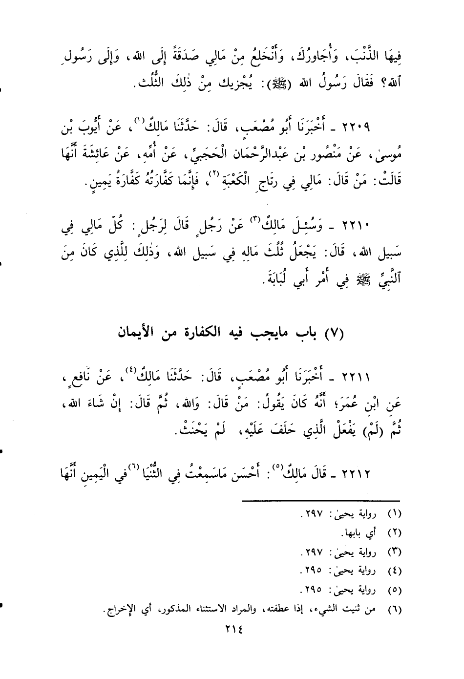 ٢٢١٠ - وسئل مَالِكٌ عن رجل قال لرجل كل مَالِي فِي سَبِيلِ اللهِ، قَالَ: يَجْعَلُ ثُلُثَ مَالِهِ فِي سَبِيلِ اللهِ، وَذَلِكَ لِلَّذِي كان من النبي صَلَّى اللَّهُ عَلَيْهِ وَسَلَّمَ فِي أَمْرِ أَبِي لُبَابَةَ.