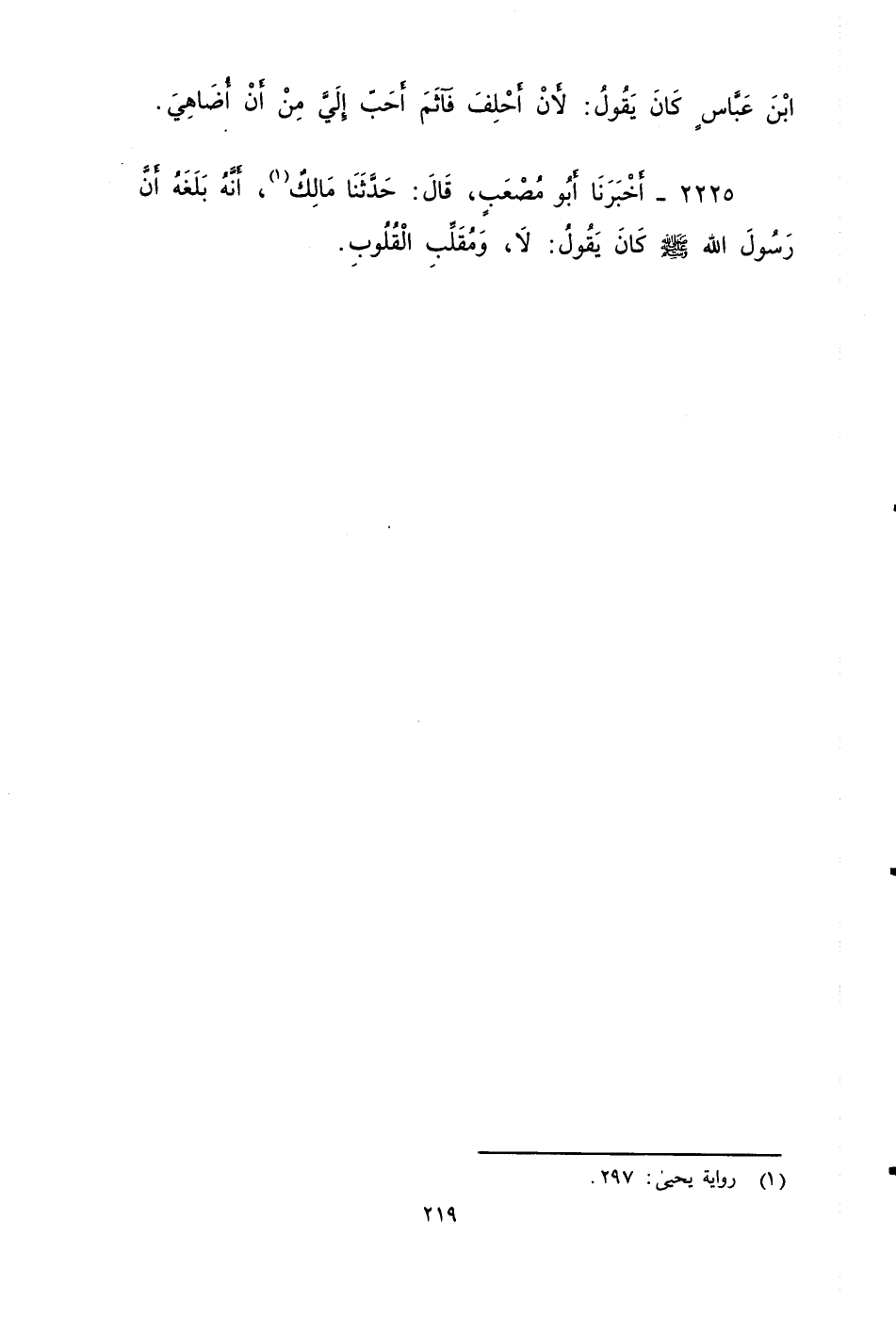 ٢٢٢٥ - أَخْبَرَنَا أَبُو مُصْعَبٍ، قَالَ: حَدَّثَنَا مَالِكٌ؛ أَنَّهُ بَلَغَهُ، أَنَّ رَسُولَ اللهِ صَلَّى اللَّهُ عَلَيْهِ وَسَلَّمَ كَانَ يَقُولُ: لَا وَمُقَلِّبِ الْقُلُوبِ.