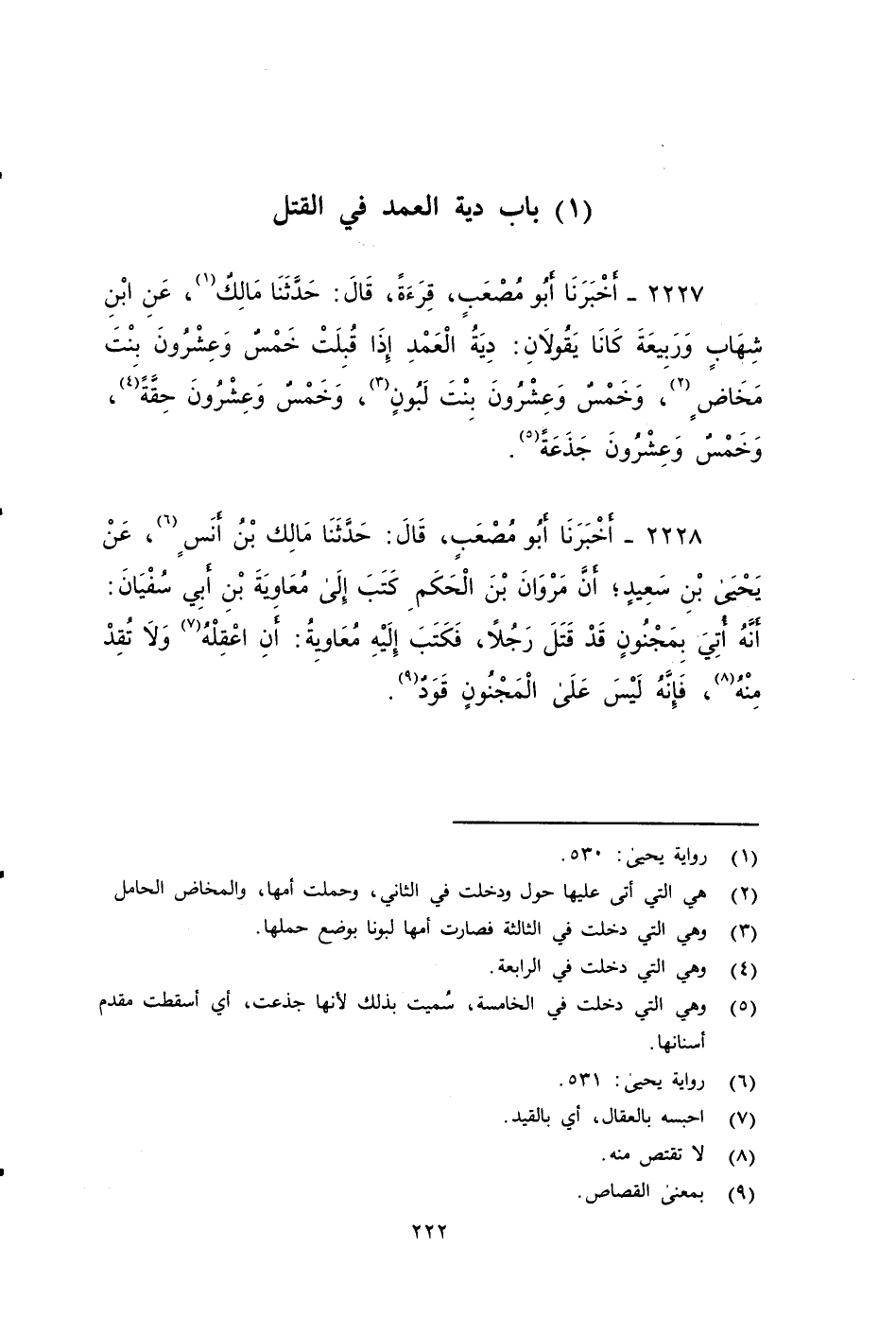 ٢٢٢٧ - أَخْبَرَنَا أَبُو مُصْعَبٍ قراءة، قَالَ: حَدَّثَنَا مَالِكٌ , أَنَّ ابْنَ شِهَابٍ وربيعة كَانَا يَقُولُان: دِيَةِ الْعَمْدِ إِذَا قُبِلَتْ خَمْسٌ وَعِشْرُونَ بِنْتَ مَخَاضٍ، وَخَمْسٌ وَعِشْرُونَ بِنْتَ لَبُونٍ، وَخَمْسٌ وَعِشْرُونَ حِقَّةً، وَخَمْسٌ وَعِشْرُونَ جَذَعَةً.