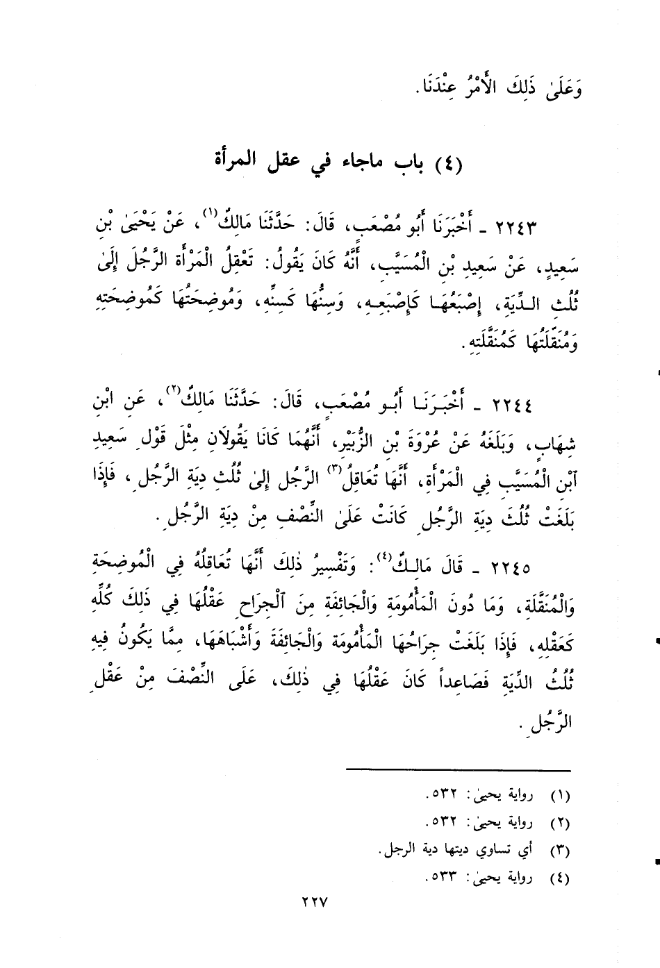 ٢٢٤٣ - أَخْبَرَنَا أَبُو مُصْعَبٍ، قَالَ: حَدَّثَنَا مَالِكٌ، عَنْ يَحْيَى بْنِ سَعِيدٍ، عَنْ سَعِيدِ بْنِ الْمُسَيَّبِ، أَنَّهُ كَانَ يَقُولُ: تُعَقِلُ الْمَرْأَةُ الرَّجُلَ إِلَى ثُلُثِ الدِّيَةِ , إِصْبَعُهَا كَإِصْبَعِهِ، وَسِنُّهَا كَسِنِّهِ، وَمُوضِحَتُهَا كَمُوضِحَتِهِ، وَمُنَقِّلَتُهَا كَمُنَقِّلَتِهِ.