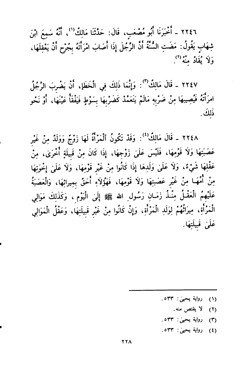 ٢٢٤٦ - أَخْبَرَنَا أَبُو مُصْعَبٍ، قَالَ: حَدَّثَنَا مَالِكٌ؛ أَنَّهُ سَمِعَ ابْنَ شِهَابٍ يَقُولُ: مَضَتِ السُّنَّةُ: أَنَّ الرَّجُلَ إِذَا أَصَابَ امْرَأَتَهُ بِجُرْحٍ , أَنَّ يعَقْلَها وَلَا يُقَادُ مِنْهُ.