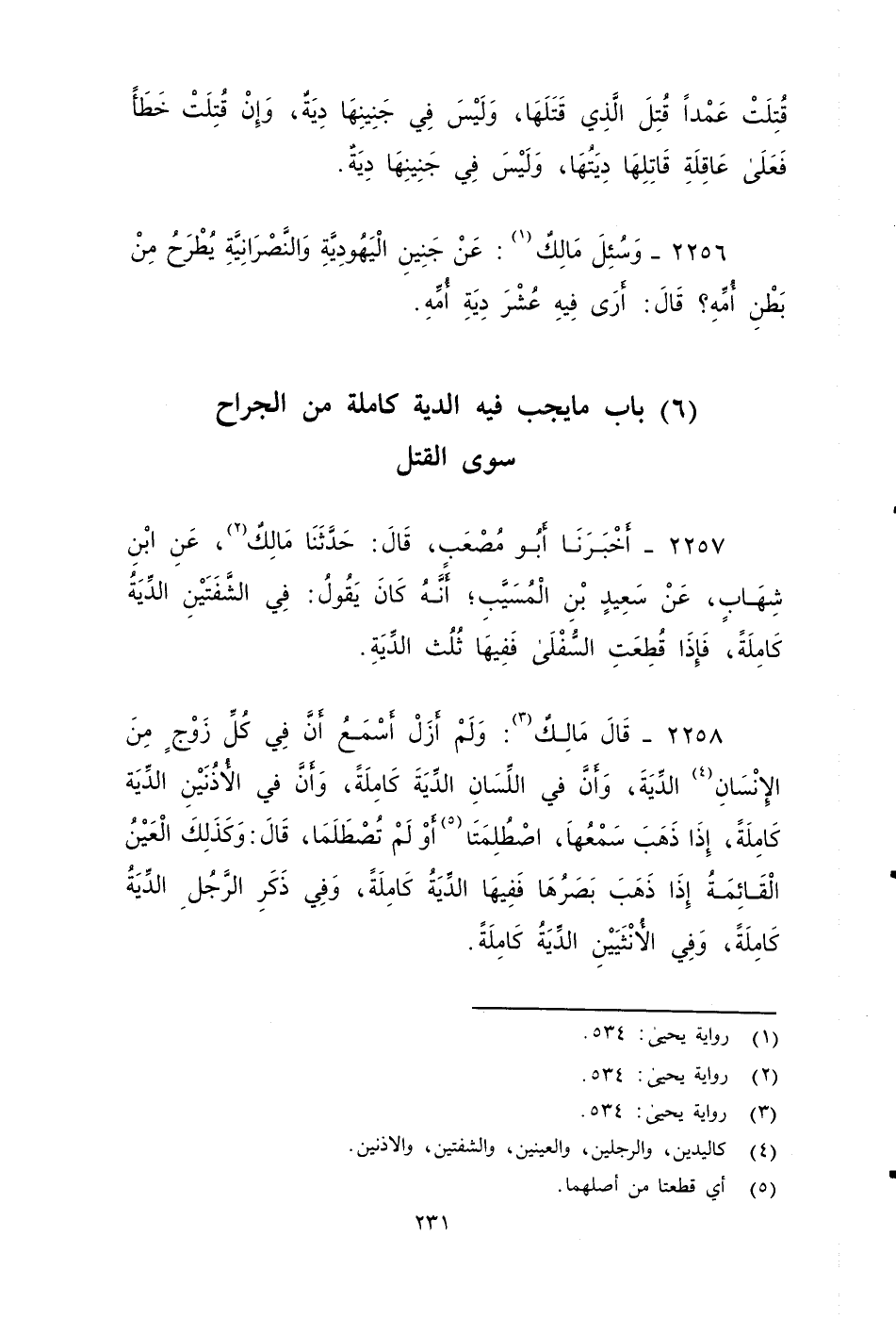 ٢٢٥٧ - أَخْبَرَنَا أَبُو مُصْعَبٍ، قَالَ: حَدَّثَنَا مَالِكٌ، عَنِ ابْنِ شِهَابٍ، عَنْ سَعِيدِ بْنِ الْمُسَيَّبِ، أَنَّهُ كَانَ يَقُولُ: فِي الشَّفَتَيْنِ الدِّيَةُ كَامِلَةً، فَإِذَا قُطِعَتِ السُّفْلَى، فَفِيهَا ثُلُثَ الدِّيَةِ ...