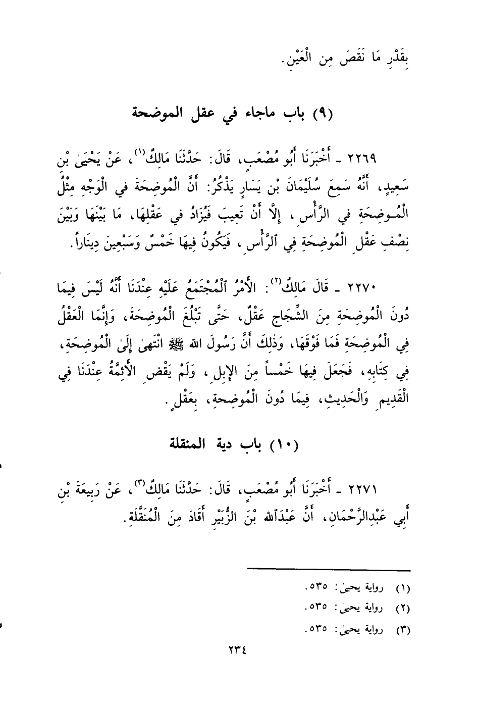 ٢٢٧٠ - قَالَ مَالِكٌ: الأََمْرُ المجتمع عليه عِنْدَنَا: أَنَّهُ لَيْسَ فِيمَا دُونَ الْمُوضِحَةِ مِنَ الشِّجَاجِ عَقْلٌ، حَتَّى تَبْلُغَ الْمُوضِحَةَ، وَإِنَّمَا الْعَقْلُ فِي الْمُوضِحَةِ فَمَا فَوْقَهَا، وَذَلِكَ أَنَّ رَسُولَ اللهِ صَلَّى اللَّهُ عَلَيْهِ وَسَلَّمَ انْتَهَى إِلَى الْمُوضِحَةِ فِي كِتَابِهِ , فَجَعَلَ فِيهَا خَمْسًا مِنَ الإِبِلِ، وَلَمْ يقْضِ الأََئِمَّةُ عندنا فِي الْقَدِيمِ، وَالْحَدِيثِ , فِيمَا دُونَ الْمُوضِحَةِ بِعَقْلٍ.....