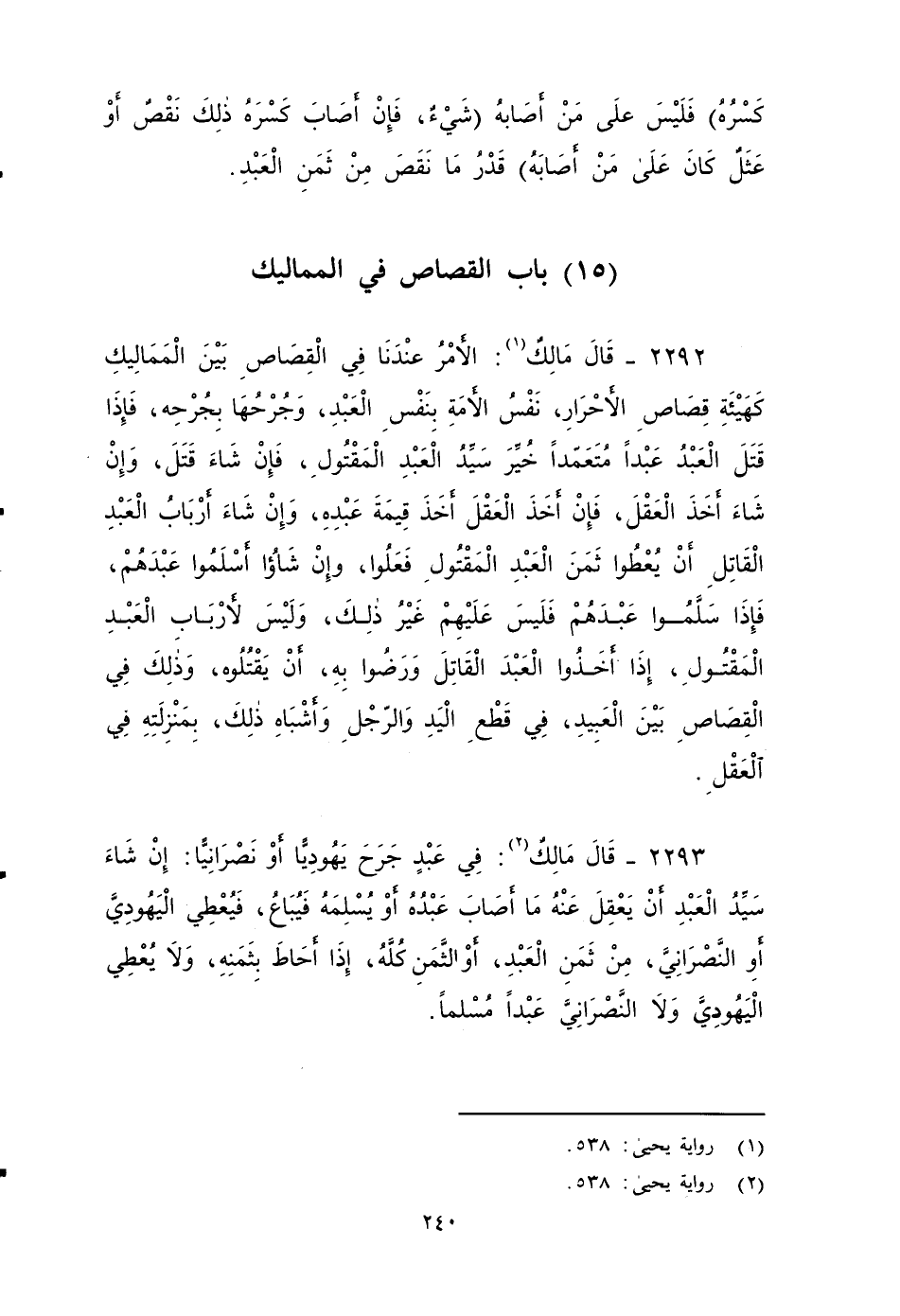 ٢٢٩٣ - قَالَ مَالِكٌ: فِي عَبْدِ جْرَحُ يَهُودِياً أَوِ نَّصْرَانِياً: إِنْ شَاءَ سَيِّدَ الْعَبْدِ أَنْ يَعْقِلَ عَنْهُ مَا أَصَابَ عبده، أَوْ يُسْلِمَهُ، فَيُبَاعُ , فَيُعْطِي الْيَهُودِيَّ أَوِ النَّصْرَانِيَّ مِنْ ثَمَنِ الْعَبْدِ أَوْ الثَمَنَ كُلَّهُ إِذا أَحَاطَ بِثَمَنِهِ، وَلَا يُعْطِي الْيَهُودِيَّ وَلَا النَّصْرَانِيَّ عَبْدًا مُسْلِمًا ...