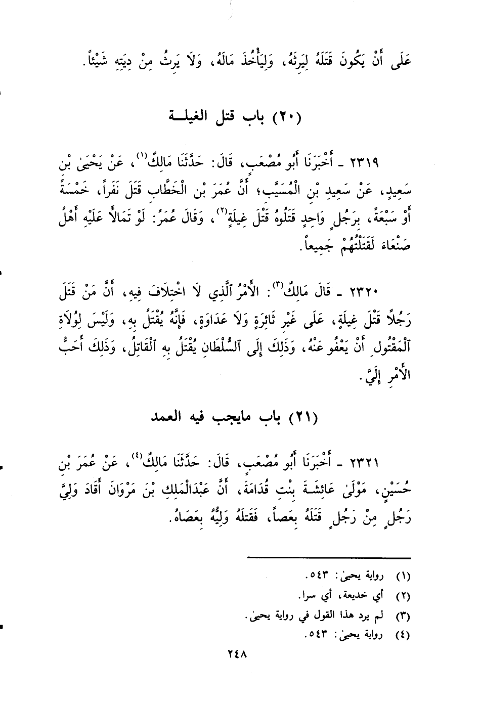 ٢٣١٩ - أَخْبَرَنَا أَبُو مُصْعَبٍ، قَالَ: حَدَّثَنَا مَالِكٌ، عَنْ يَحْيَى بْنِ سَعِيدٍ، عَنْ سَعِيدِ بْنِ الْمُسَيَّبِ، أَنَّ عُمَرَ بْنَ الْخَطَّابِ قَتَلَ نَفَرًا , خَمْسَةً أَوْ سَبْعَةً بِرَجُلٍ وَاحِدٍ , قَتَلُوهُ قَتْلَ غِيلَةٍ , وَقَالَ عُمَرُ: لَوْ تَمَالأَ عَلَيْهِ أَهْلُ صَنْعَاءَ لَقَتَلْتُهُمْ جَمِيعًا.