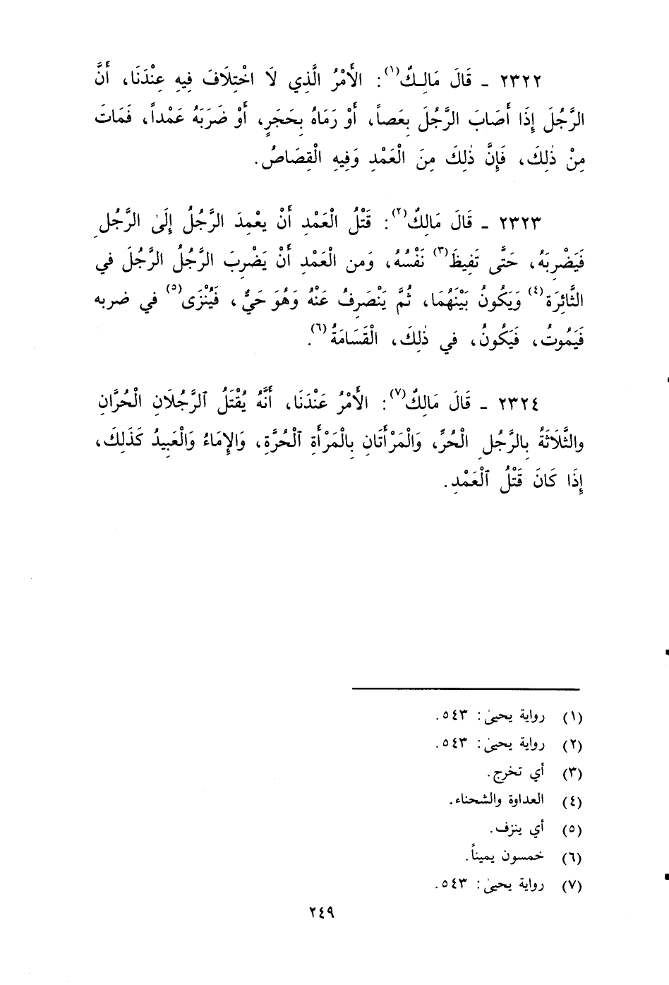 ٢٣٢٢ - قَالَ مَالِكٌ: الأََمْرُ الَّذِي لَا اخْتِلَافَ فِيهِ عِنْدَنَا، أَنَّ الرَّجُلَ إِذَا ضَرَبَ الرَّجُلَ بِعَصًا أَوْ رَمَاهُ بِحَجَرٍ أَوْ ضَرَبَهُ عَمْدًا , فَمَاتَ مِنْ ذَلِكَ، فَإِنَّ ذَلِكَ من الْعَمْدُ , وَفِيهِ الْقِصَاصُ.