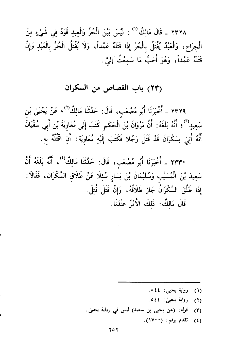 ٢٣٢٩ - أَخْبَرَنَا أَبُو مُصْعَبٍ، قَالَ: حَدَّثَنَا مَالِكٌ؛ عن يحيى بن سعيد أَنَّهُ بَلَغَهُ , أَنَّ مَرْوَانَ بْنَ الْحَكَمِ كَتَبَ إِلَى مُعَاوِيَةَ بْنِ أَبِي سُفْيَانَ , أَنَّهُ أُتِيَ بِسَكْرَانَ قَدْ قَتَلَ رَجُلاً، فَكَتَبَ إِلَيْهِ مُعَاوِيَةُ: أَنِ اقْتُلْهُ بِهِ.