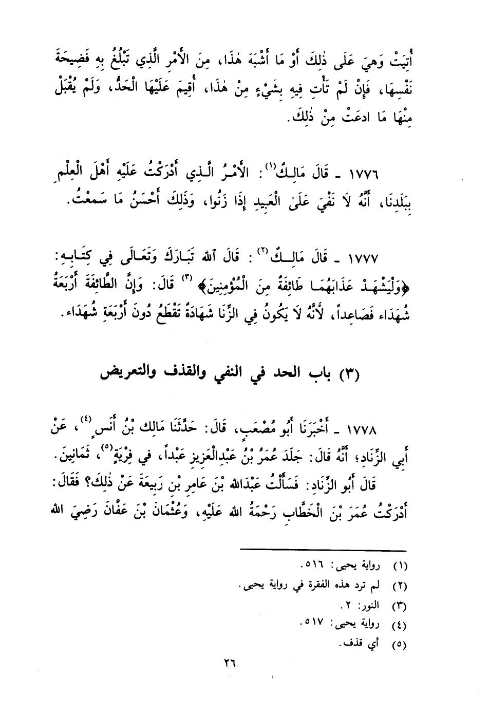 ١٧٧٧ - قَالَ مَالِكٌ: قَالَ اللَّهُ تَبَارَكَ وَتَعَالَى فِي كِتَابِهِ: {وَلْيَشْهَدْ عَذَابَهُمَا طَائِفَةٌ مِنَ الْمُؤْمِنِينَ} قَالَ: وَإِنَّ الطَّائِفَةَ أَرْبَعَةُ شُهَدَاء فَصَاعِدًا، لأَنَّهُ لَا يَكُونُ فِي الزِّنَا شَهَادَةٌ تَقْطَعُ دُونَ أَرْبَعَةِ شُهَدَاء.
