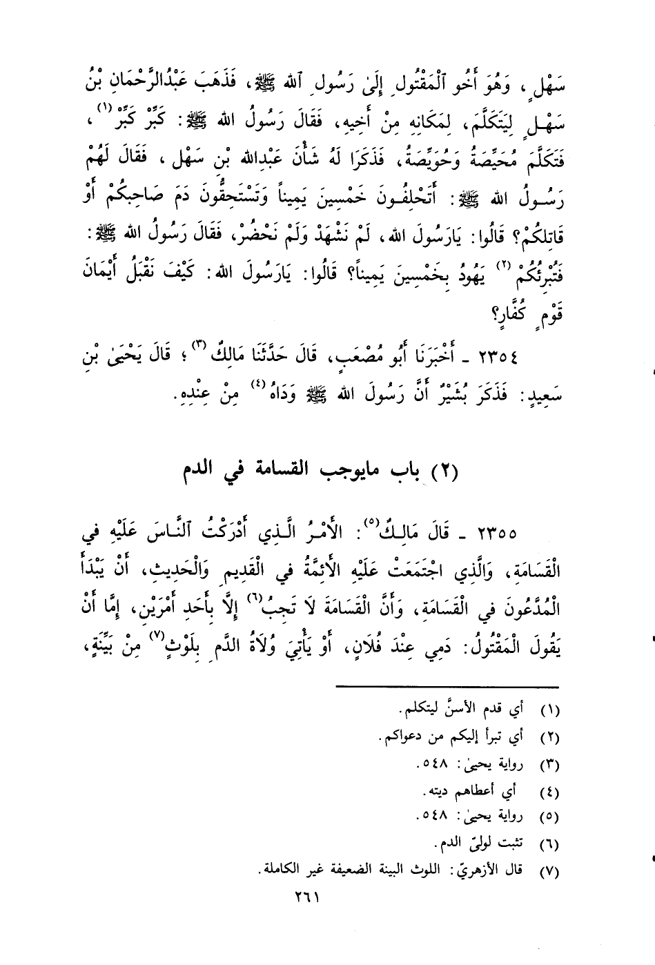 ٢٣٥٥ - قَالَ مَالِكٌ: الأََمْرُ الذي أدركت الناس عَلَيْهِ فِي الْقَسَامَةِ، وَالَّذِي اجْتَمَعَتْ عَلَيْهِ الأََئِمَّةُ فِي الْقَدِيمِ وَالْحَدِيثِ: أَنْ يَبْدَأَ الْمُدَّعُونَ فِي الْقَسَامَةِ، وَأَنَّ الْقَسَامَةَ لَا تَجِبُ إِلَاّ بِأَحَدِ أَمْرَيْنِ، إِمَّا أَنْ يَقُولَ الْمَقْتُولُ: دَمِي عِنْدَ فُلَانٍ، أَوْ يَأْتِيَ وُلَاةُ الدَّمِ بِلَوْثٍ مِنْ بَيِّنَةٍ، وَإِنْ لَمْ تَكُنْ قَاطِعَةً عَلَى الَّذِي يُدَّعَى عَلَيْهِ الدَّمُ، فَهَذَا يُوجِبُ الْقَسَامَةَ لِلْمُدَّعِينَ الدَّمَ عَلَى مَنِ ادَّعَوْهُ عَلَيْهِم، وَلَا يجِبُ الْقَسَامَةُ عِنْدَنَا إِلَاّ بِأَحَدِ هَذَيْنِ الْأمريْنِ.