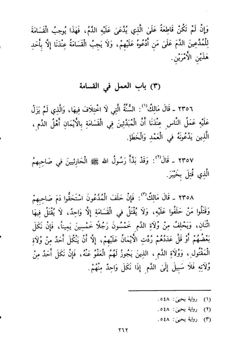 ٢٣٥٦ - قَالَ مَالِكٌ: السُّنَّةُ الَّتِي لَا اخْتِلَافَ فِيهَا، وَالَّذِي لَمْ يَزَلْ عَلَيْهِ عَمَلُ النَّاسِ عِنْدَنَا: أَنَّ الْمُبَدَّئِينَ في الْقَسَامَةِ بالأيمان أَهْلُ الدَّمِ، الَّذِينَ يَدَّعُونَهُ فِي الْعَمْدِ وَالْخَطَإِ.