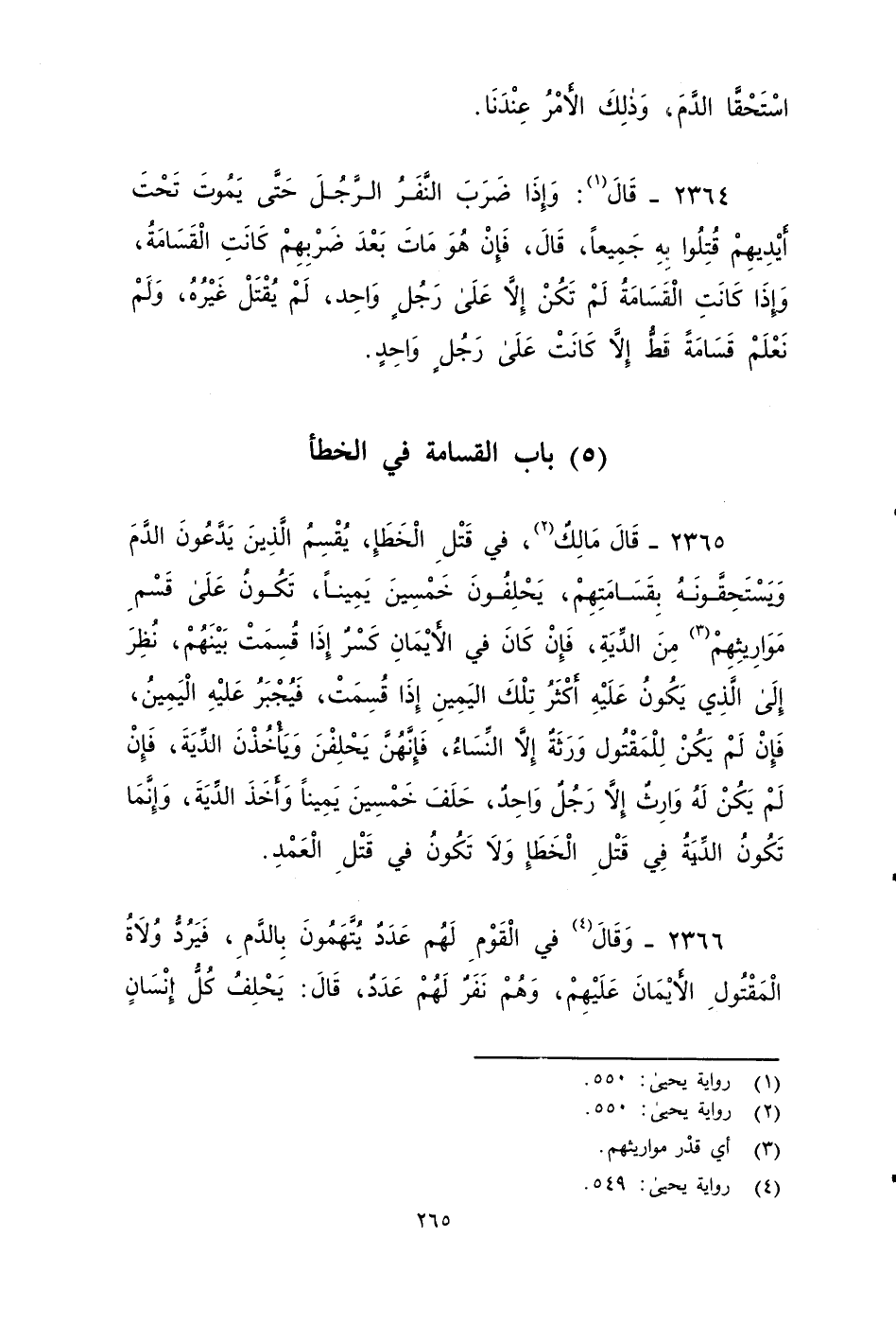 ٢٣٦٦ - وَقَالَ مَالِكٌ: فِي الْقَوْمِ لَهُمُ الْعَدَدُ يُتَّهَمُونَ بِالدَّمِ فَيَرُدُّ وُلَاةُ الْمَقْتُولِ الأََيْمَانَ عَلَيْهِمْ، وَهُمْ نَفَرٌ لَهُمْ عَدَدٌ , قال: يَحْلِفُ كُلُّ إِنْسَانٍ مِنْهُمْ عَنْ نَفْسِهِ خَمْسِينَ يَمِينًا، وَلَا يقْطَعُ عَلَيْهِمْ الأََيْمَانُ بِقَدْرِ عَدَدِهِمْ، وَلَا يَبْرَئهم دُونَ أَنْ يَحْلِفَ كُلُّ إِنْسَانٍ مِنْهُمْ عَنْ نَفْسِهِ خَمْسِينَ يَمِينًا.