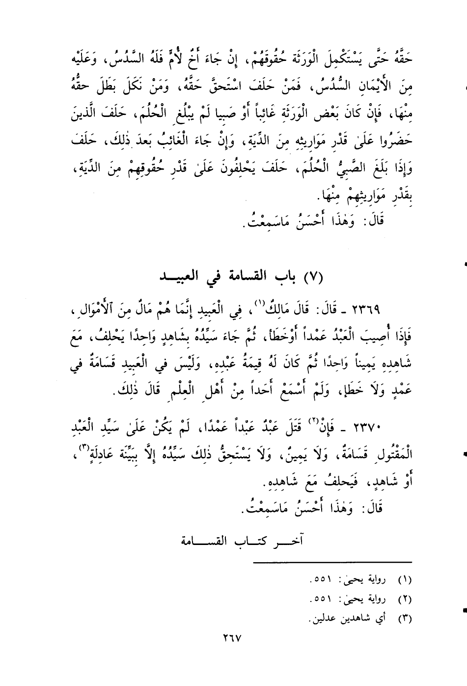 ٢٣٦٩ - قال: قَالَ مَالِكٌ: فِي الْعَبِيدِ إنما هم مال من الأموال: فإِذَا أُصِيبَ الْعَبْدُ عَمْدًا أَوْ خَطَأً، ثُمَّ جَاءَ سَيِّدُهُ بِشَاهِدٍ واحد, يحَلَفَ مَعَ شَاهِدِهِ يَمِينًا وَاحِدَاً، ثُمَّ كَانَ لَهُ قِيمَةُ عَبْدِهِ، وَلَيْسَ فِي الْعَبِيدِ قَسَامَةٌ فِي عَمْدٍ وَلَا خَطَإٍ، وَلَمْ أَسْمَعْ أَحَدًا مِنْ أَهْلِ الْعِلْمِ قَالَ ذَلِكَ.