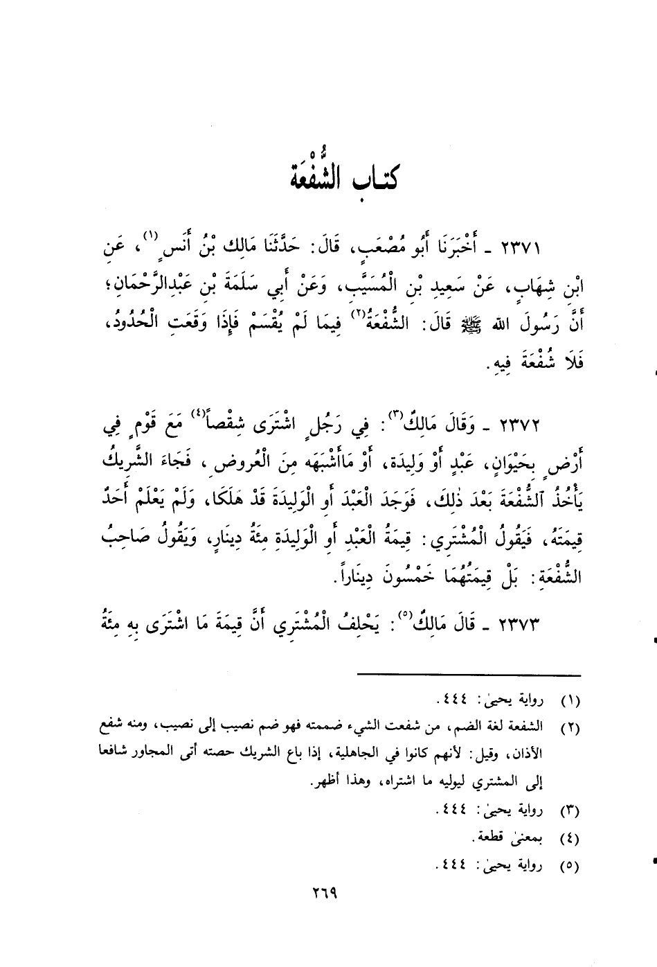 ٢٣٧١ - أَخْبَرَنَا أَبُو مُصْعَبٍ، قَالَ: حَدَّثَنَا مَالِكٌ بن أنس، عَنْ ابْنِ شِهَابٍ، عَنْ سَعِيدِ بْنِ الْمُسَيِّبِ، وَعَنْ أَبِي سَلَمَةَ بْنِ عَبْدِ الرَّحْمَنِ، أَنَّ رَسُولَ اللَّهِ صَلى الله عَلَيه وَسَلم قال: الشُّفْعَةِ فِيمَا لَمْ يُقْسَمْ، فَإِذَا وَقَعَتِ الْحُدُودُ فَلَا شُفْعَةَ فِيهِ.