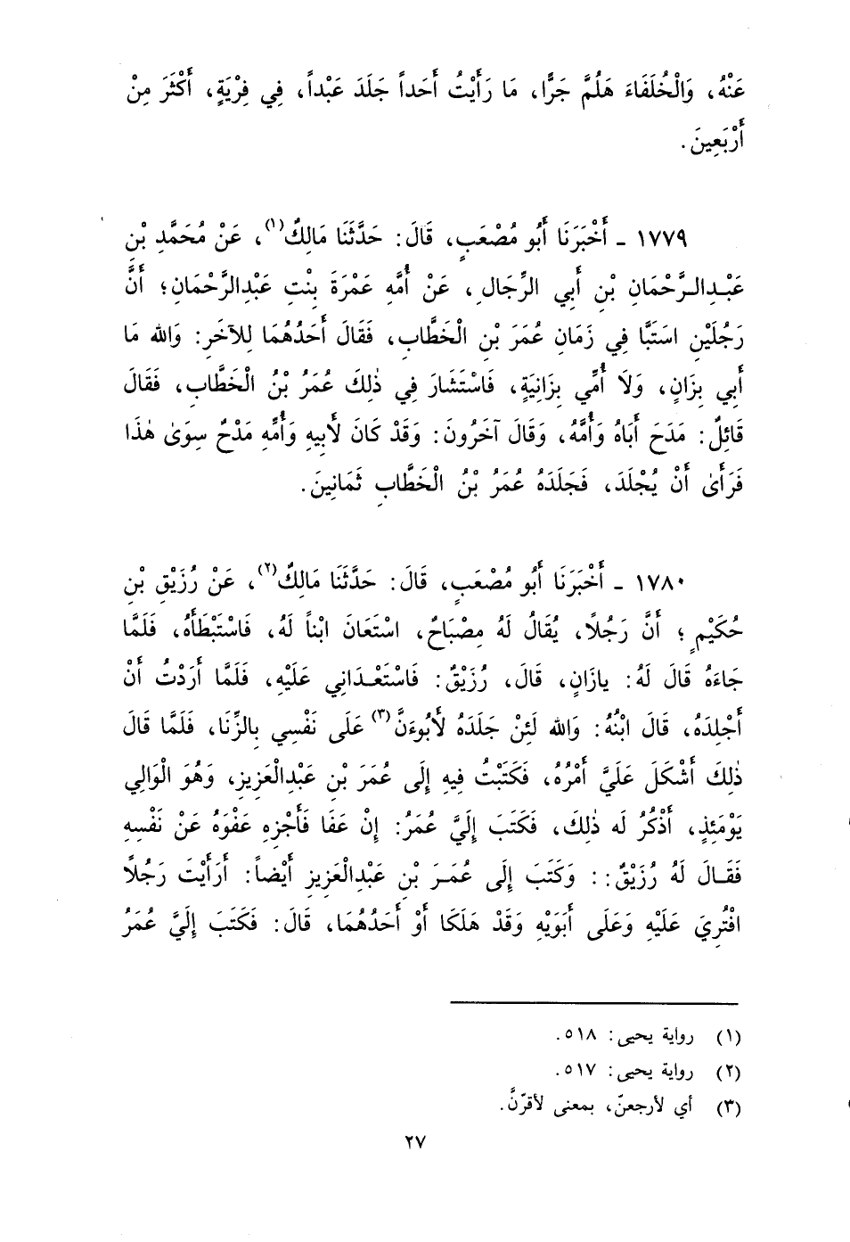 ١٧٧٩ - أَخْبَرَنَا أَبُو مُصْعَبٍ، قَالَ: حَدَّثَنَا مَالِكٌ، عَنْمُحَمَّدِ بْنِ عَبْدِ الرَّحْمَنِ بن أَبِي الرِّجَالِ , عَنْ أُمِّهِ عَمْرَةَ بِنْتِ عَبْدِ الرَّحْمَنِ، أَنَّ رَجُلَيْنِ اسْتَبَّا فِي زَمَانِ عُمَرَ بْنِ الْخَطَّابِ , فَقَالَ أَحَدُهُمَا لِلآخَرِ: وَاللَّهِ مَا أَبِي بِزَانٍ، وَلَا أُمِّي بِزَانِيَةٍ، فَاسْتَشَارَ فِي ذَلِكَ عُمَرُ بْنُ الْخَطَّابِ , فَقَالَ قَائِلٌ: مَدَحَ أَبَاهُ وَأُمَّهُ، وَقَالَ آخَرُونَ: قَدْ كَانَ لأَبِيهِ وَأُمِّهِ مَدْحٌ سوى هَذَا , فرَأى أَنْ يجْلِدَ , فَجَلَدَهُ عُمَرُ بن الخطاب ثَمَانِينَ.