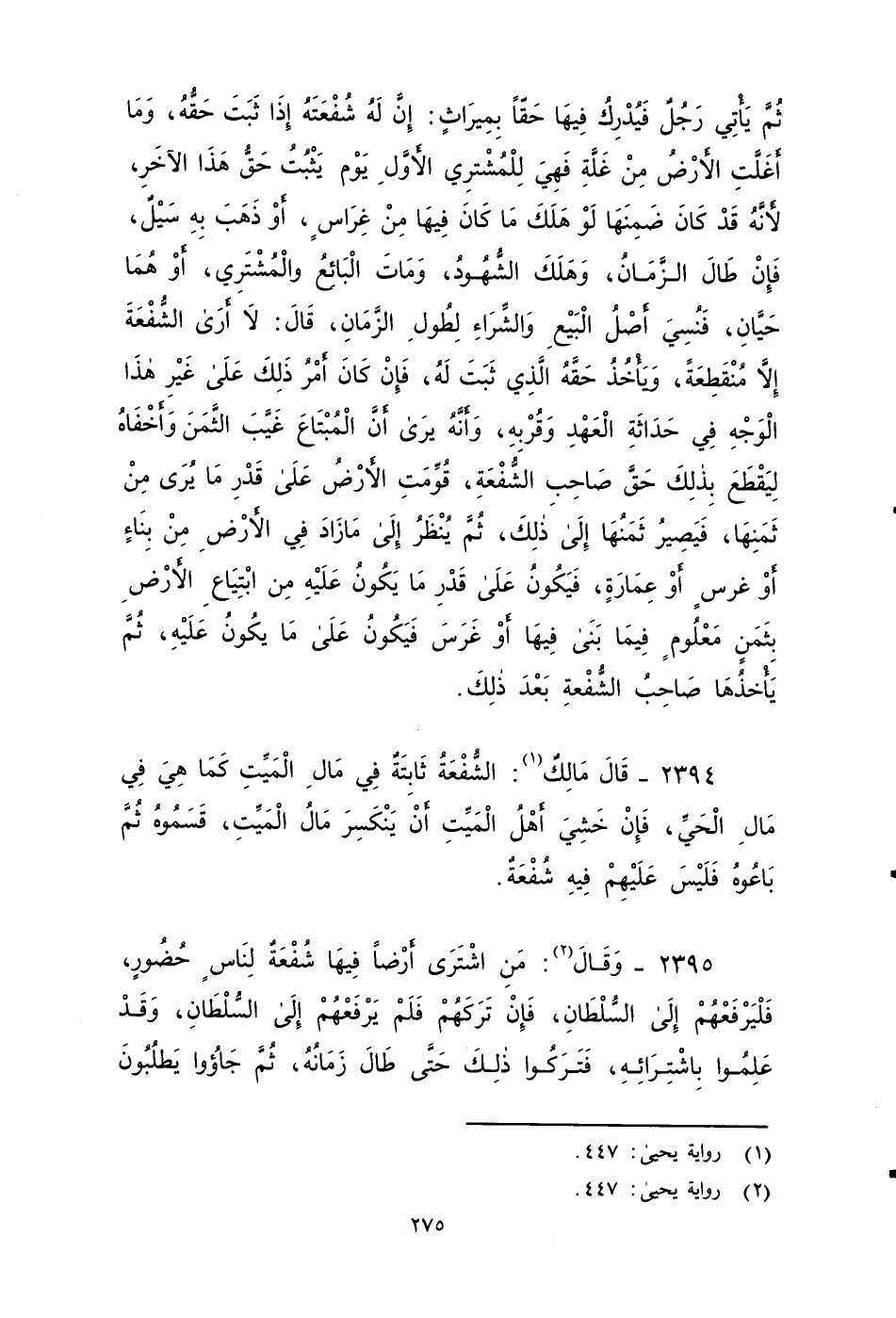 ٢٣٩٤ - قَالَ مَالِكٌ: الشُّفْعَةُ ثَابِتَةٌ فِي مَالِ الْمَيِّتِ , كَمَا هِيَ فِي مَالِ الْحَيِّ، فَإِنْ خَشِيَ أَهْلُ الْمَيِّتِ أَنْ يَنْكَسِرَ مَالُ الْمَيِّتِ، قَسَمُوهُ , ثُمَّ بَاعُوهُ , فَلَيْسَ عَلَيْهِمْ فِيهِ شُفْعَةٌ.