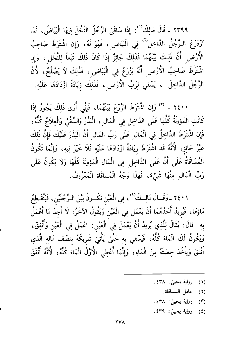 ٢٣٩٩ - قَالَ مَالِكٌ: إِذَا سَاقَى الرَّجُلُ النَّخْلَ، فِيهَا الْبَيَاضُ، فَمَا ازْدَرَعَ الرَّجُلُ الدَّاخِلُ فِي الْبَيَاضِ , فَهُوَ لَهُ، وَإِنِ اشْتَرَطَ صَاحِبُ الأََرْضِ أَنَّ ذلك بينهما فذلك جائز إذا كان ذلك تبعاً للنخل وإن اشترط صاحب الأرض أنه يَزْرَعُ فِي الْبَيَاضِ، فَذَلِكَ لَا يَصْلُحُ، لأَنَّ الرَّجُلَ الدَّاخِلَ يَسْقِي لِرَبِّ الأََرْضَ، فَذَلِكَ زِيَادَةٌ ازْدَادَهَا عَلَيْهِ.