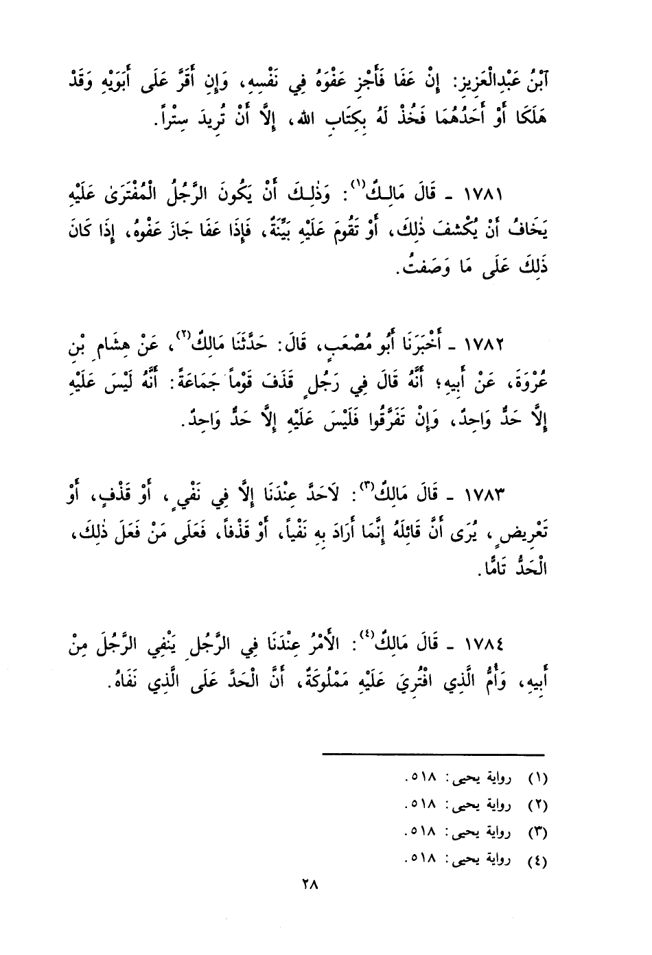 ١٧٨٣ - قَالَ مَالِكٌ: لَا حَدَّ عِنْدَنَا إِلَاّ فِي نَفْيٍ أَوْ قَذْفٍ أَوْ تَعْرِيضٍ , يُرَى أَنَّ قَائِلَهُ إِنَّمَا أَرَادَ بِه نَفْيًا أَوْ قَذْفًا، فَعَلَى مَنْ قَالَ ذَلِكَ الْحَدُّ تَامًّا.