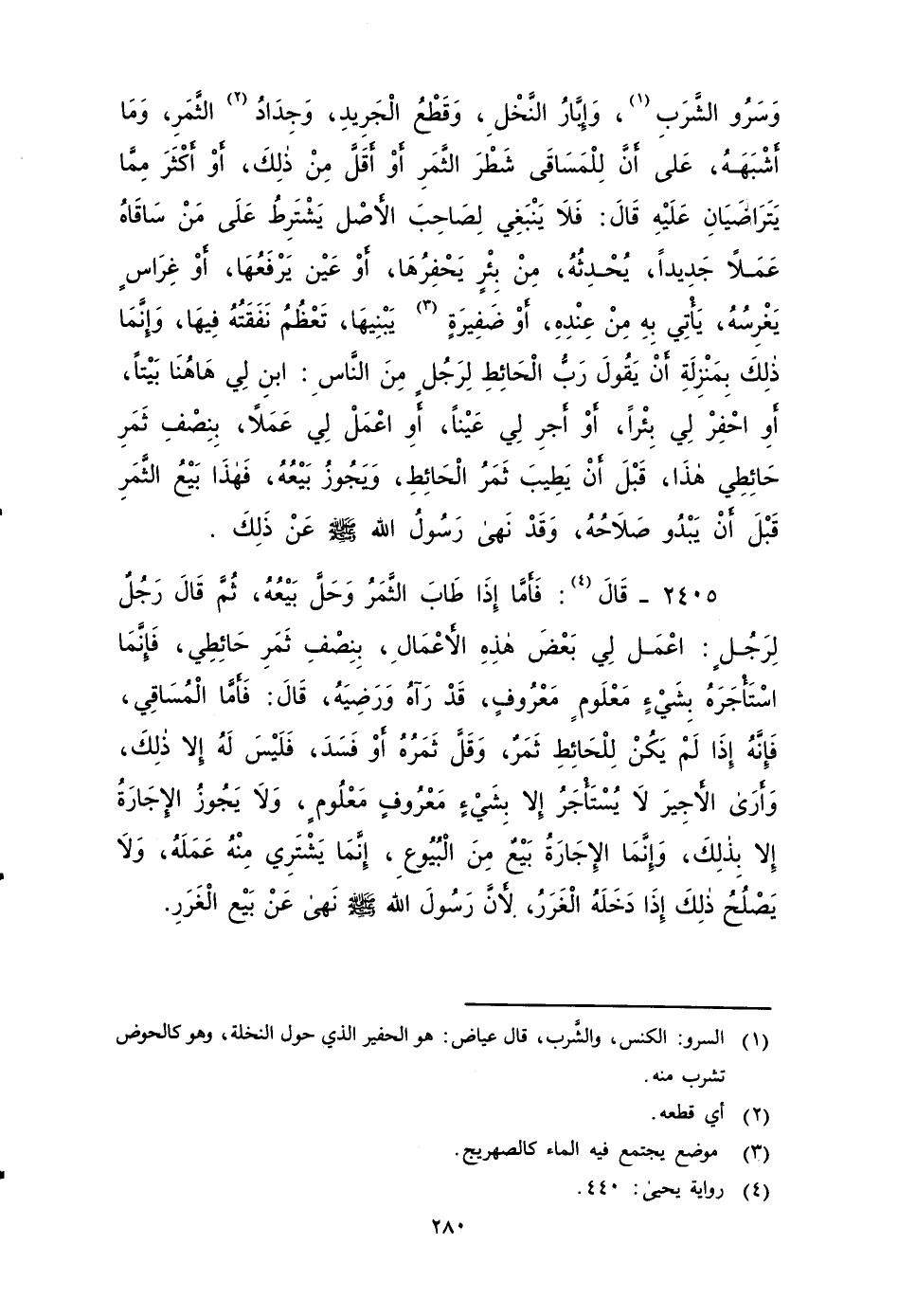 ٢٤٠٤ - قَالَ مَالِكٌ: السُّنَّةُ فِي الْمُسَاقَاةِ الَّتِي يَجُوزُ لصاحب الأرض أَنْ يَشْتَرِطَهَا عَلَى الْمُسَاقِي: شَدُّ الْحِظَارِ، وَخَمُّ الْعَيْنِ , وَسَرْوُ الشَّرَبِ، وَإِبَّارُ النَّخْلِ، وَقَطْعُ الْجَرِيدِ، وَجَداد الثَّمَرِ , وما أَشْبَهُهُ، عَلَى أَنَّ لِلْمُسَاقِي شَطْرَ الثَّمَرِ أَوْ أَقَلَّ مِنْ ذَلِكَ، أَوْ أَكْثَرَ مما يتَرَاضَيَان عَلَيْهِ , قال: فلاينبغي لصَاحِبَ الأََصْلِ يَشْتَرِطُ على من ساقاه عَمَلاً جَدِيداً، يُحْدِثُهُ مِنْ بِئْرٍ يَحْفِرُهَا، أَوْ عَيْنٍ يَرْفَعُهَا، أَوْ غِرَاسٍ يَغْرِسُهُ، يَأْتِي بِه مِنْ عِنْدِهِ، أَوْ ضَفِيرَةٍ يَبْنِيهَا، تَعْظُمُ نَفَقَتُهُ فِيهَا، وَإِنَّمَا ذَلِكَ بِمَنْزِلَةِ أَنْ يَقُولَ رَبُّ الْحَائِطِ لِرَجُلٍ مِنَ النَّاسِ: ابْنِ لِي هَاهُنَا بَيْتًا، أَوِ احْفِرْ لِي بِئْرًا، أَوْ أَجْرِ لِي عَيْنًا، أَوِ اعْمَلْ لِي عَمَلاً , بِنِصْفِ ثَمَرِ حَائِطِي هَذَا , قَبْلَ أَنْ يَطِيبَ ثَمَرُ الْحَائِطِ، وَيَجوز بَيْعُهُ، فَهَذَا بَيْعُ الثَّمَرِ قَبْلَ أَنْ يَبْدُوَ صَلَاحُهُ، وَقَدْ نَهَى رَسُولُ اللهِ صَلَّى اللَّهُ عَلَيْهِ وَسَلَّمَ عَنْ ذلك.