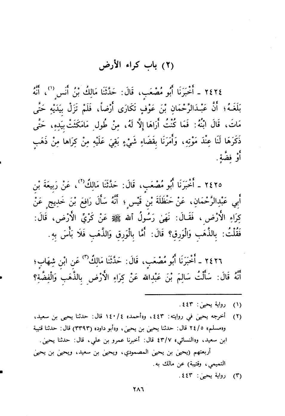 ٢٤٢٥ - أَخْبَرَنَا أَبُو مُصْعَبٍ، قَالَ: حَدَّثَنَا مَالِكٌ، عَنْ رَبِيعَةَ بْنِ أَبِي عَبْدِ الرَّحْمَنِ، عَنْ حَنْظَلَةَ بْنِ قَيْسٍ، أنه سأل رَافِعِ بْنِ خَدِيجٍ عن كراء الأرض، فقال: نهى رَسُولَ اللَّهِ صَلى الله عَلَيه وَسَلم عَنْ كِرَي الأرض قال: فقَلت: بالذهب والورق؟ قَالَ: أَمَّا بَالْوَرِقِ والذهب فَلَا بَأْسَ بِهِ.