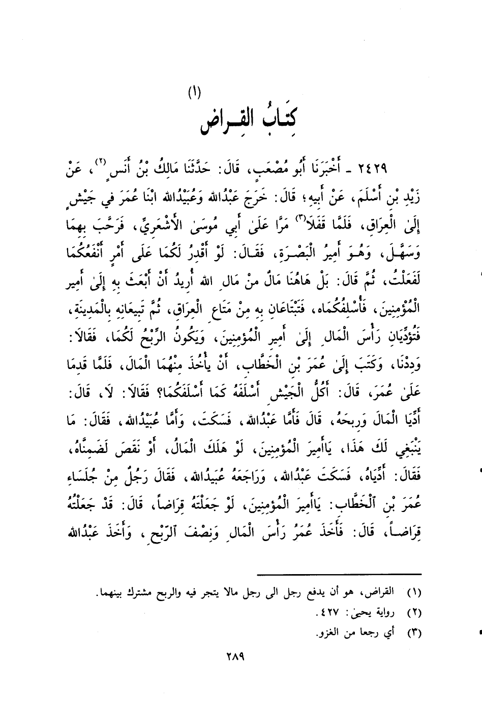 ٢٤٢٩ - أَخْبَرَنَا أَبُو مُصْعَبٍ، قَالَ: حَدَّثَنَا مَالِكٌ بن أنس، عَنْ زَيْدِ بْنِ أَسْلَمَ، عَنْ أَبِيهِ , قَالَ: خَرَجَ عَبْدُ اللهِ , وَعُبَيْدُ اللهِ , ابْنَا عُمَرَ فِي جَيْشٍ إِلَى الْعِرَاقِ , فَلَمَّا قَفَلَا مَرَّا عَلَى أَبِي مُوسَى الأََشْعَرِيِّ، فَرَحَّبَ بِهِمَا وَسَهَّلَ، وَهُوَ أَمِيرُ الْبَصْرَةِ، فقَالَ: لَوْ أَقْدِرُ لَكُمَا عَلَى أَمْرٍ أَنْفَعُكُمَا لَفَعَلْتُ، ثُمَّ قَالَ: بَلَى هَاهُنَا مَالٌ مِنْ مَالِ اللهِ، أُرِيدُ أَنْ أَبْعَثَ بِهِ إِلَى أَمِيرِ الْمُؤْمِنِينَ، فَأُسْلِفُكُمَاهُ , فَتَبْتَاعَانِ بِهِ مِنْ مَتَاعِ الْعِرَاقِ، ثُمَّ تَبِيعَانِهِ بِالْمَدِينَةِ، فَتُؤَدِّيَانِ رَأْسَ الْمَالِ إِلَى أَمِيرِ الْمُؤْمِنِينَ، وَيَكُونُ الرِّبْحُ لَكُمَا، فَقَالَا: وَدِدْنَا، وَكَتَبَ إِلَى عُمَرَ بْنِ الْخَطَّابِ , أَنْ يَأْخُذَ مِنْهُمَا الْمَالَ، فَلَمَّا قَدِمَا على عُمَرَ , قَالَ: أَكُلُّ الْجَيْشِ أَسْلَفَهُ كمَا أَسْلَفَكُمَا؟ فقَالَا: لَا، قَالَ أَدِّيَا الْمَالَ وَرِبْحَهُ، قال: فَأَمَّا عَبْدُ اللهِ , فَسَكَتَ، وَأَمَّا عُبَيْدُ اللهِ , فَقَالَ: مَا يَنْبَغِي لَكَ هذا يَا أَمِيرَ الْمُؤْمِنِينَ , هَذَا , لَوْ هَلَكَ الْمَالُ أَوْ نَقَصَ لَضَمِنَّاهُ؟ فَقَالَ: أَدِّيَاهُ، فَسَكَتَ عَبْدُ اللهِ، وَرَاجَعَهُ عُبَيْدُ اللهِ، فَقَالَ رَجُلٌ مِنْ جُلَسَاءِ عُمَرَ بن الخطاب: يَا أَمِيرَ الْمُؤْمِنِينَ , لَوْ جَعَلْتَهُ قِرَاضًا؟ قَالَ: قَدْ جَعَلْتُهُ قِرَاضًا، فَأَخَذَ عُمَرُ رَأْسَ الْمَالِ وَنِصْفَ رِبْحِهِ، وَأَخَذَ عَبْدُ اللهِ , وَعُبَيْدُ اللهِ , نِصْفَ رِبْحِ ذلك الْمَالِ.