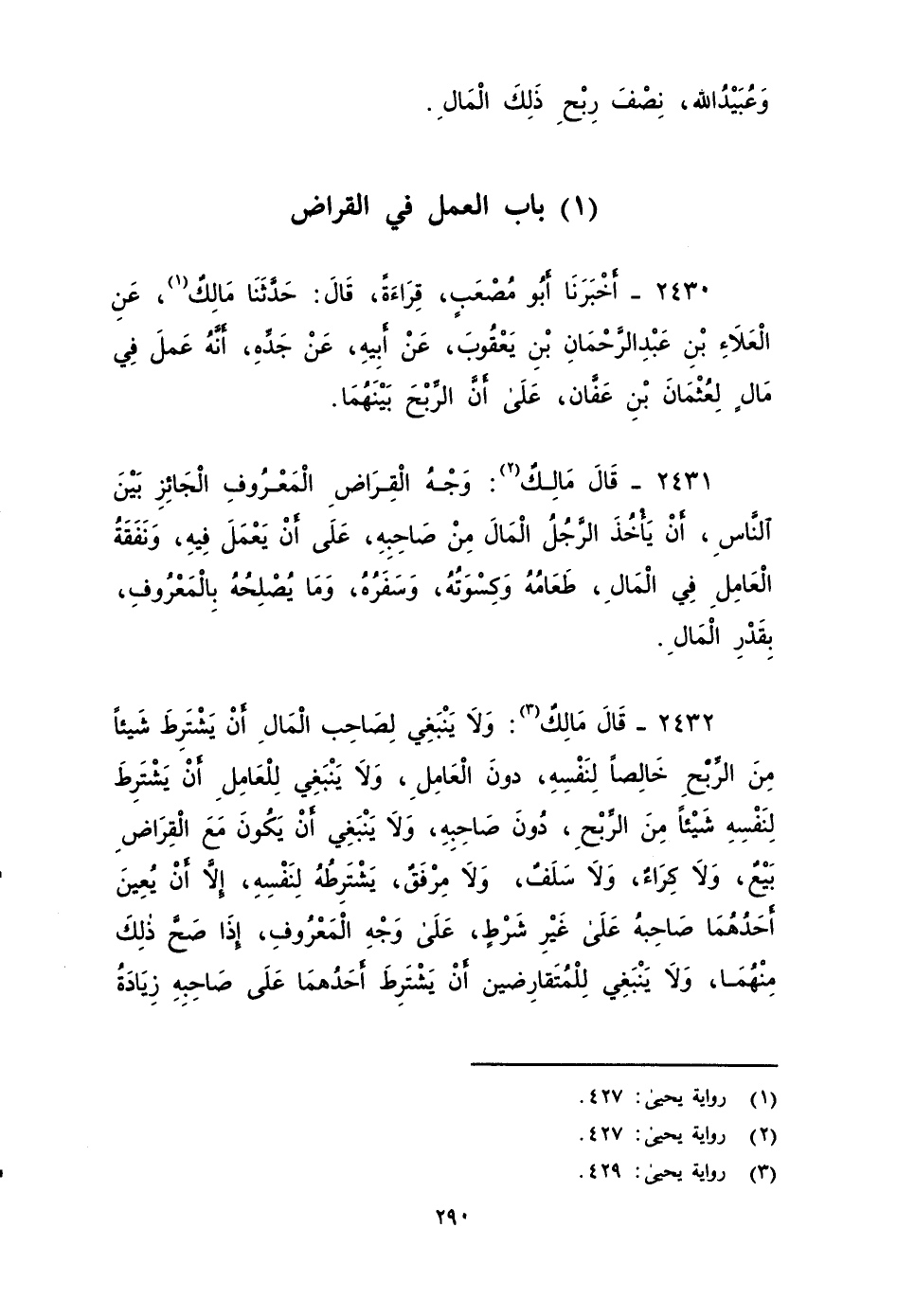 ٢٤٣٠ - أَخْبَرَنَا أَبُو مُصْعَبٍ قراءة، قَالَ: حَدَّثَنَا مَالِكٌ، عَنِ الْعَلَاءِ بْنِ عَبْدِ الرَّحْمَنِ بن يعقوب، عَنْ أَبِيهِ، عَنْ جَدِّهِ، أَنَّه عمل في مَال لعُثْمَانَ بْنَ عَفَّانَ , عَلَى أَنَّ الرِّبْحَ بَيْنَهُمَا.