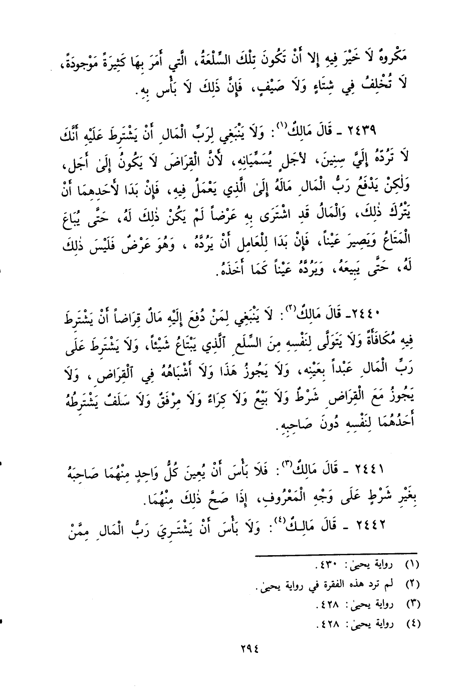 ٢٤٣٩ - قَالَ مَالِكٌ: ولَا يَنبغي لرب الْمَالَ قِرَاضًا أَنْ يَشْتَرِطَ عليه أَنَّكَ لَا تَرُدُّهُ إِلَيَّ سِنِينَ، لأَجَلٍ يُسَمِّيَانِهِ، لأَنَّ الْقِرَاضَ لَا يَكُونُ إِلَى أَجَلٍ، وَلَكِنْ يَدْفَعُ رَبُّ الْمَالِ مَالَهُ إِلَى الَّذِي يَعْمَلُ فِيهِ، فَإِنْ بَدَا لأَحَدِهِمَا أَنْ يَتْرُكَ ذَلِكَ، وَالْمَالُ قد اشْتَرِى بِهِ عرضاً لم يكن ذَلِكَ لَهُ، حَتَّى يُبَاعَ الْمَتَاعُ، وَيَصِيرَ عَيْنًا، فَإِنْ بَدَا لِلْعَامِلِ أَنْ يَرُدَّهُ، وَهُوَ عَرْضٌ، فليس ذَلِكَ لَهُ، حَتَّى يَبِيعَهُ، ويَرُدَّهُ عَيْنًا كَمَا أَخَذَهُ.