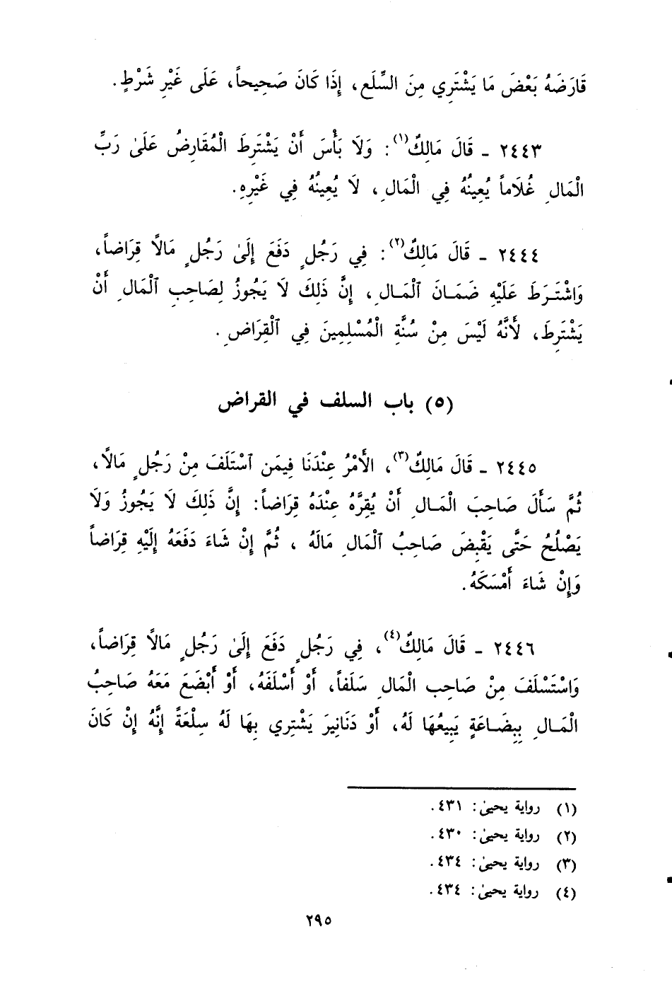 ٢٤٤٥ - قَالَ مَالِكٌ: الأمر عندنا فِيمن اسْتلَفَ من رَجُلٍ مَالاً، ثُمَّ سَأَلَ صاحب الْمَالَ أَنْ يُقِرَّهُ عِنْدَهُ قِرَاضًا ,إن ذَلِكَ لَايجوز ولا يصلح حَتَّى يَقْبِضَ صاحب الْمَالَ مَالَهُ، ثُمَّ إِنْ شَاءَ دْفَعَهُ إِلَيْهِ قِرَاضًا وْ إِنْ شَاءَ أَمْسِكَهُ.