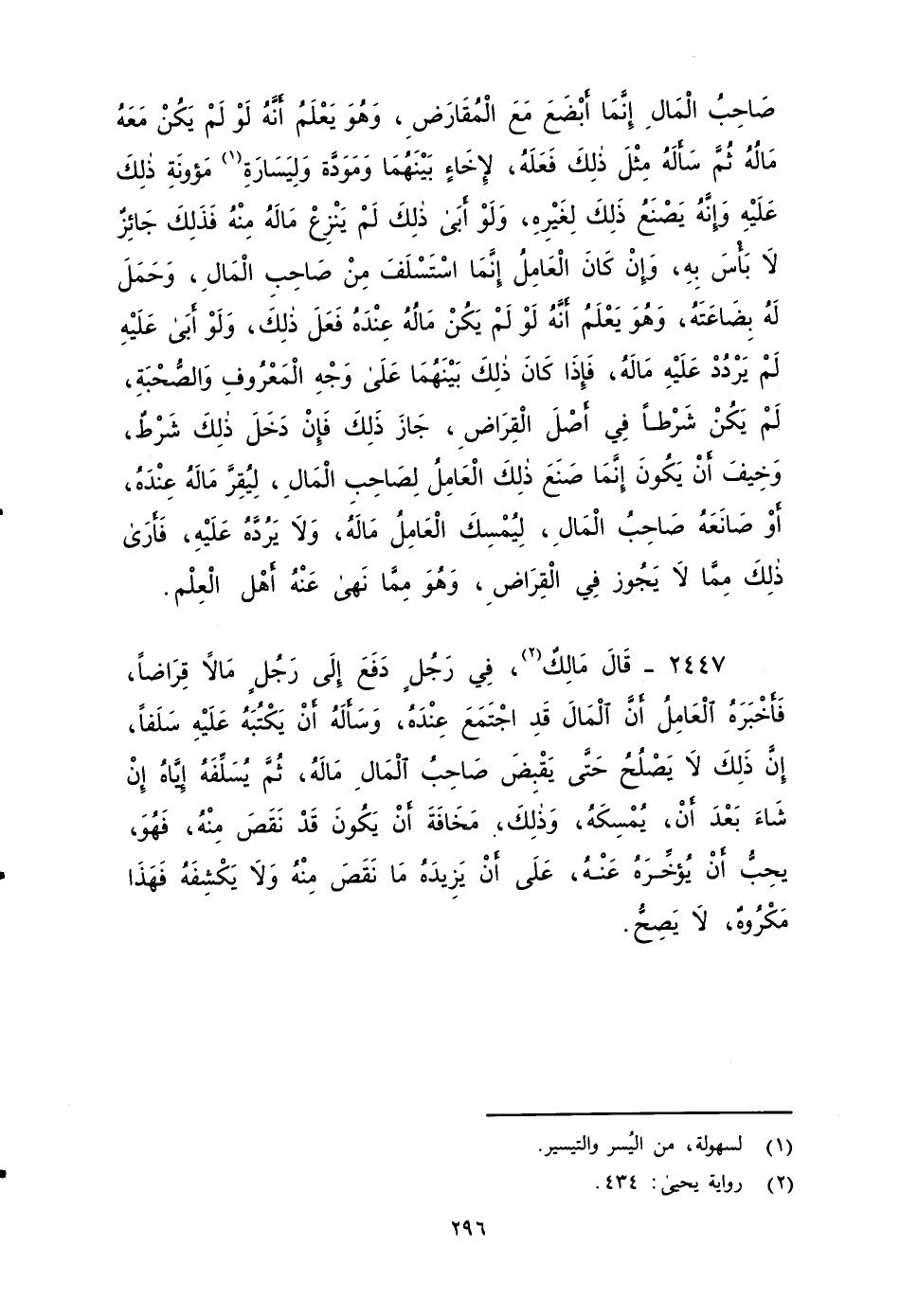 ٢٤٤٧ - قَالَ مَالِكٌ فِي رَجُلٍ دَفَعَ إِلَى رَجُلٍ مَالاً قِرَاضًا، فَأَخْبَرَهُ أَنَّهُ قَدِ اجْتَمَعَ عِنْدَهُ، وَسَأَلَهُ أَنْ يَكْتُبَهُ عَلَيْهِ سَلَفًا، قَالَ: لَا أُحِبُّ ذَلِكَ، حَتَّى يَقْبِضَ مِنْهُ مَالَهُ، ثُمَّ يُسَلِّفَهُ إِيَّاهُ إِنْ شَاءَ، أَوْ يُمْسِكَهُ، وَإِنَّمَا ذَلِكَ مَخَافَةَ أَنْ يَكُونَ قَدْ نَقَصَ فِيهِ، فَهُوَ يُحِبُّ أَنْ يُؤَخِّرَهُ عَنْهُ، عَلَى أَنْ يَزِيدَهُ فِيهِ مَا نَقَصَ مِنْهُ، فَذَلِكَ مَكْرُوهٌ , وَلَا يَجُوزُ وَلَا يَصْلُحُ.