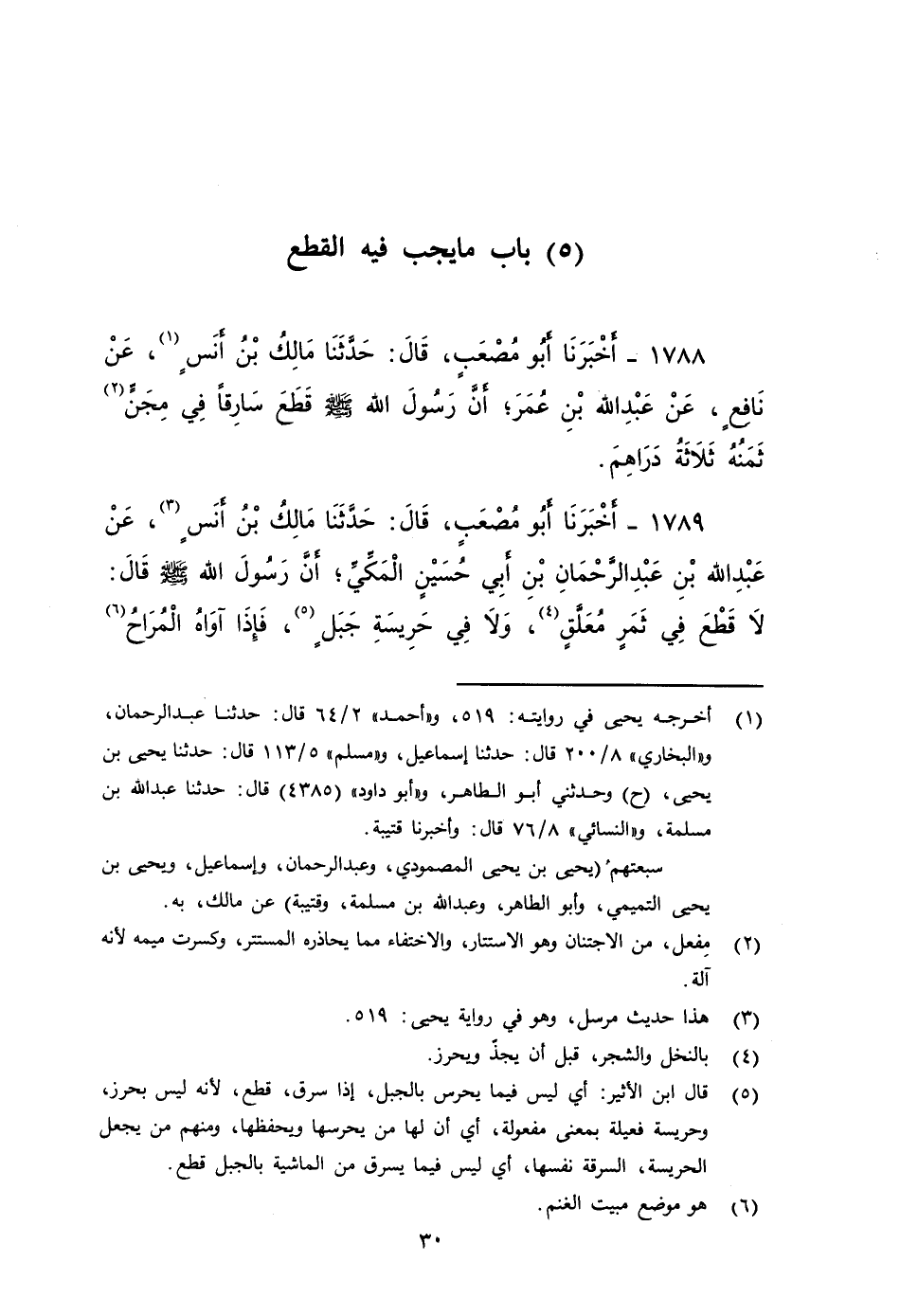 ١٧٨٩ - أَخْبَرَنَا أَبُو مُصْعَبٍ، قَالَ: حَدَّثَنَا مَالِكٌ بن أنس، عَنْ عَبْدِ اللَّهِ بْنِ عَبْدِ الرَّحْمَنِ بْنِ أَبِي حُسَيْنٍ الْمَكِّيِّ، أَنَّ رَسُولَ اللَّهِ صَلَّى اللَّهُ عَلَيْهِ وَسَلَمَ، قَالَ: لا قَطْعَ فِي ثَمَرٍ مُعَلَّقٍ، وَلَا فِي حَرِيسَةِ جَبَلٍ، فَإِذَا آوَاهُ الْمُرَاحُ أَوِ الْجَرِينُ، فَالْقَطْعُ فِيمَا بْلُغُ ثَمَنَ الْمِجَنِّ.