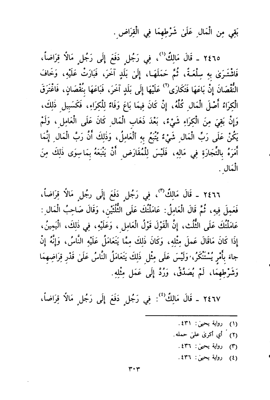 ٢٤٦٥ - قَالَ مَالِكٌ فِي رَجُلٍ دَفَعَ إِلَى رَجُلٍ مَالاً قِرَاضًا، فَاشْتَرَى بِهِ سلعة، ثم حَمَلَهُا إِلَى بَلَدِ آخر، فَبَارَت عَلَيْهِ، وَخَافَ النُّقْصَانَ إِنْ بَاعَهُا، فَتَكَارَى عَلَيْهِ إِلَى بَلَدٍ آخَرَ، فَبَاعَها بِنُقْصَانٍ، فَاغْتَرَقَ الْكِرَاءُ أَصْلَ الْمَالِ كُلَّهُ , إِنْ كَانَ فِيمَا بَاعَ وَفَاءٌ لِلْكِرَاءِ، فَكسَبِيلُ ذَلِكَ، وَإِنْ بَقِيَ مِنَ الْكِرَاءِ شَيْءٌ بَعْدَ ذهاب الْمَالِ , كَانَ عَلَى الْعَامِلِ، وَلَمْ يَكُنْ عَلَى رَبِّ الْمَالِ شَيْءٌ يُتْبَعُ بِهِ العامل، وَذَلِكَ أَنَّ رَبَّ الْمَالِ إِنَّمَا أَمَرَهُ بِالتِّجَارَةِ فِي مَالِهِ، فَلَيْسَ لِلْمُقَارَضِ أَنْ يَتْبَعَهُ بِمَا سِوَى ذَلِكَ مِنَ الْمَالِ.