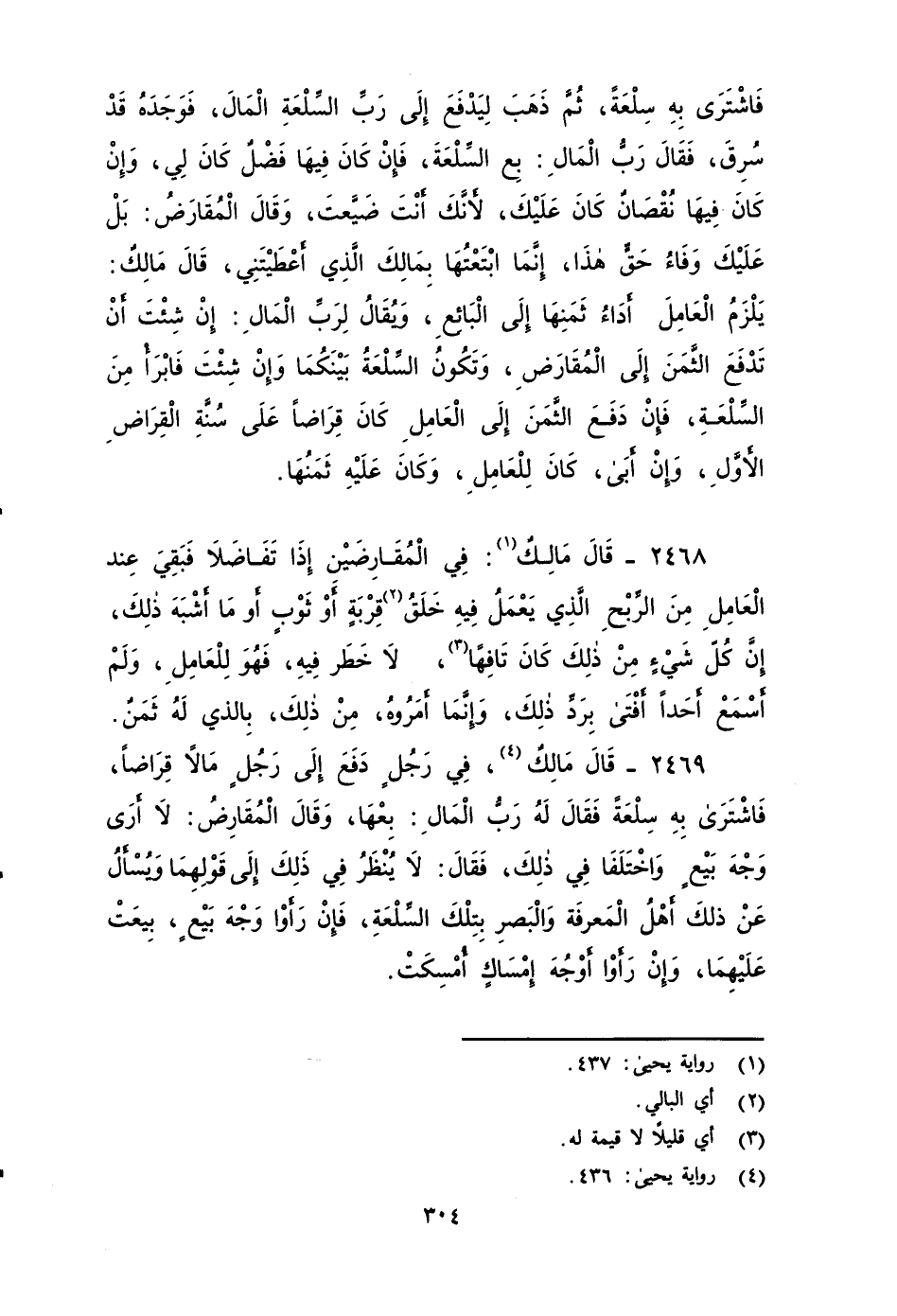 ٢٤٦٧ - قَالَ مَالِكٌ فِي رَجُلٍ دفع إلى رَجُل مِالاً قِرَاضًا , فَاشْتَرَى بِهَ سِلْعَةً، ثُمَّ ذَهَبَ لِيَدْفَعَ إِلَى رَبِّ السِّلْعَةِ الْمِال، فَوَجَدَهَ قَدْ سُرِقَ، فَقَالَ رَبُّ الْمَالِ: بِعِ السِّلْعَةَ، فَإِنْ كَانَ فِيهَا فَضْلٌ كَانَ لِي، وَإِنْ كَانَ فِيهَا نُقْصَانٌ كَانَ عَلَيْكَ، لأَنَّكَ أَنْتَ ضَيَّعْتَ، وَقَالَ الْمُقَارَضُ: بَلْ عَلَيْكَ وَفَاءُ حَقِّ هَذَا، إِنَّمَا ابتعتُهَا بِمَالِكَ الَّذِي أَعْطَيْتَنِي , قَالَ مَالِكٌ: يَلْزَمُ الْعَامِلَ أَدَاءُ ثَمَنِهَا إِلَى الْبَائِعِ، وَيُقَالُ لِربِ الْمَالِ: إِنْ شِئْتَ أَن تدفع الْثمِن إِلَى الْمُقَارَضِ، وَتكون السِّلْعَةُ بَيْنَكُمَا، وَإِنْ شِئْتَ فَابْرَأْ مِنَ السِّلْعَةِ، فَإِنْ دَفَعَ الْثمن إِلَى الْعَامِلِ , كَانَ قِرَاضًا عَلَى سُنَّةِ الْقِرَاضِ الأََوَّلِ، وَإِنْ أَبَى , كَانَ لِلْعَامِلِ , وَكَانَ عَلَيْهِ ثَمَنُهَا.