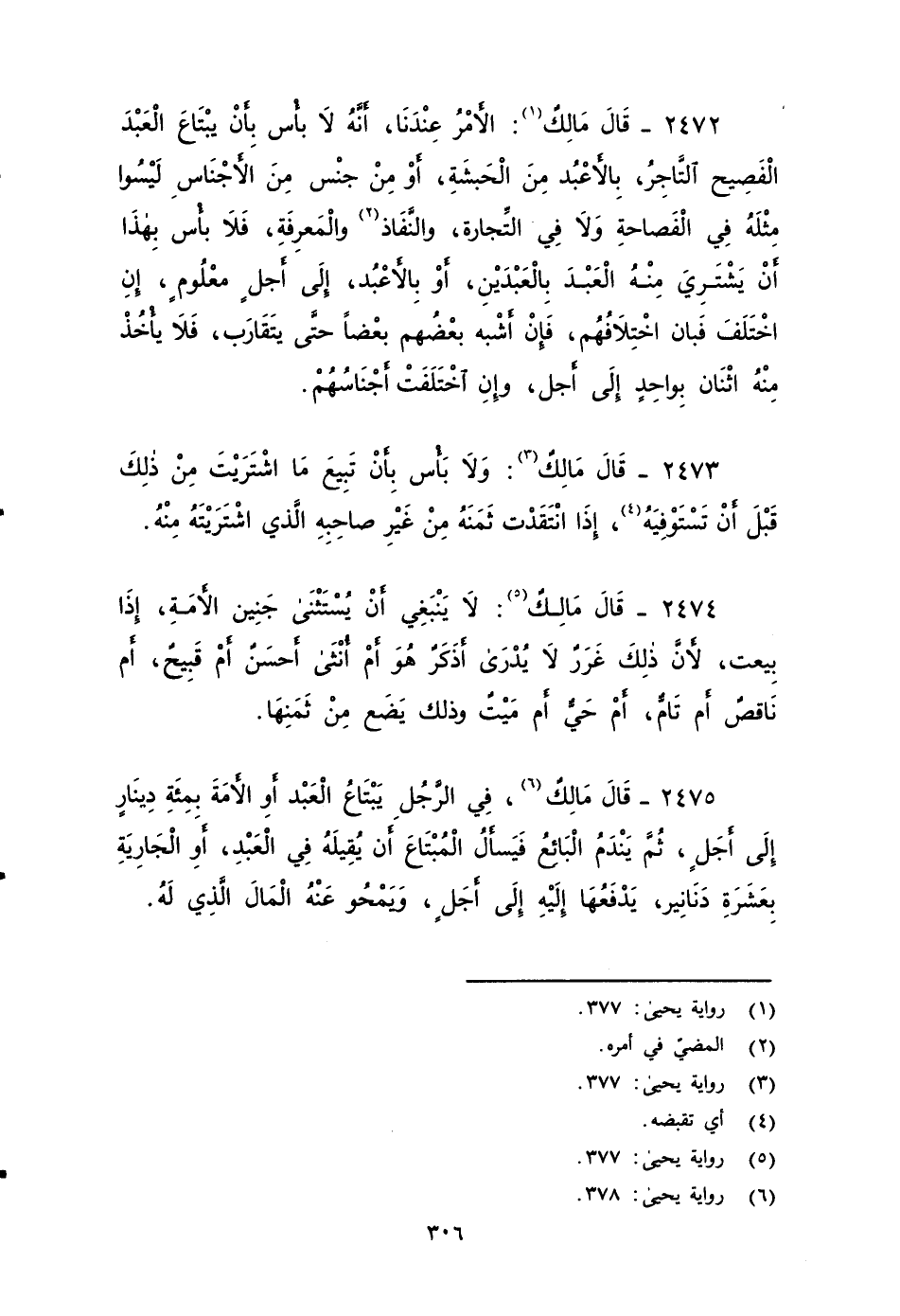 ٢٤٧٢ - قَالَ مَالِكٌ: وَالأََمْرُ عِنْدَنَا: أَنَّهُ لَا بَأْسَ بِأَنْ يَبْتَاعَ الْعَبْدَ الْفَصِيحَ التَّاجِرَ، بِالأََعْبُدِ مِنَ الْحَبَشَةِ أَوْ مِنْ جِنْسٍ مِنَ الأََجْنَاسِ، لَيْسُوا مِثْلَهُ فِي الْفَصَاحَةِ، وَلَا فِي التِّجَارَةِ، وَالنَّفَاذِ وَالْمَعْرِفَةِ فلَا بَأْسَ بِهَذَا , أَنْ يشْتَرِيَ مِنْهُ الْعَبْدَ بِالْعَبْدَيْنِ، أَوْ بِالأََعْبُدِ إِلَى أَجَلٍ مَعْلُومٍ، إِن اخْتَلَفَ فَبَانَ اخْتِلَافُهُم، فَإِنْ أَشْبَهَ بَعْضُهم بَعْضًا حَتَّى يَتَقَارَبَ، فَلَا يَأْخُذْ مِنْهُ اثْنَيْنِ بِوَاحِدٍ إِلَى أَجَلٍ، وَإِنِ اخْتَلَفَتْ أَجْنَاسُهُمْ.