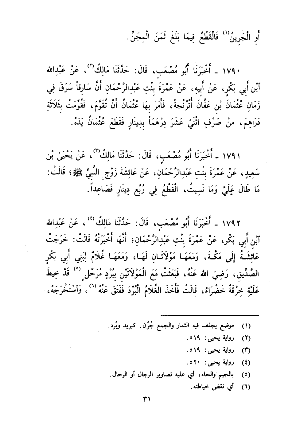١٧٩٢ - أَخْبَرَنَا أَبُو مُصْعَبٍ، قَالَ: حَدَّثَنَا مَالِكٌ، عَنْ عَبْدِ اللَّهِ بْنِ أَبِي بَكْرِ، عَنْ عَمْرَةَ بِنْتِ عَبْدِ الرَّحْمَنِ، أَنَّهَا أخبرته قَالَتْ: خَرَجَتْ عَائِشَةُ إِلَى مَكَّةَ وَمَعَهَا مَوْلَاتَانِ لَهَا وَمَعَهَا غُلَامٌ لِبَنِي أَبِي بَكْرٍ الصِّدِّيقِ - رضي الله عنه -، فَبَعَثَتْ مَعَ الْمَوْلَاتَيْنِ بِبُرْدٍ مُرَحلٍ قَدْ خِيطَ عَلَيْهِ خِرْقَةٌ خَضْرَاءُ، قَالَتْ: فَأَخَذَ الْغُلَامُ الْبُرْدَ، فَفَتَقَ عَنْهُ واسْتَخْرَجَهُ وَجَعَلَ مَكَانَهُ ليْفا أَوْ فَرْوَةً وَخَاطَ عَلَيْهِ، فَلَمَّا قَدِمَتِ الْمَوْلَاتَانِ الْمَدِينَةَ دَفَعَتَا ذَلِكَ إِلَى أَهْلِهِ، فَلَمَّا فَتَقُوا عَنْهُ وَجَدُوا فِيهِ اللِّبْدَ وَلَمْ يَجِدُوا الْبُرْدَ، فَكَلَّمُوا الْمَوْلاتَيْنِ، فَكَلَّمَتَا عَائِشَةَ أَوْ كَتَبَتَا إِلَيْهَا، وَاتَّهَمَتَا الْعَبْدَ، فَسُئِلَ الْعَبْدُ عَنْ ذَلِكَ، فَاعْتَرَفَ، فَأَمَرَتْ بِهِ عَائِشَةُ، فَقُطِعَتْ يَدُهُ، وَقَالَتْ عَائِشَةُ - رضي الله عنها -: الْقَطْعُ فِي رُبُعِ دِينَارٍ فَصَاعِدًا.
