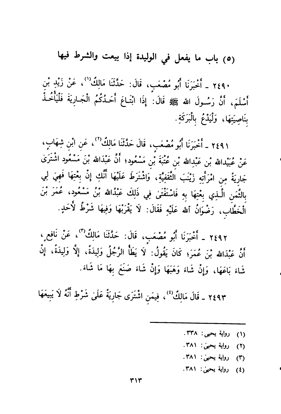 ٢٤٩١ - أَخْبَرَنَا أَبُو مُصْعَبٍ، قَالَ: حَدَّثَنَا مَالِكٌ، عَنِ ابْنِ شِهَابٍ، أَنَّ عُبَيْدَ اللهِ بْنَ عَبْدِ اللهِ بْنِ عُتْبَةَ بْنِ مَسْعُودٍ أَخْبَرَهُ , أَنَّ عَبْدَ اللهِ بْنَ مَسْعَودٍ اشترى جَارِيَةً مِنِ امْرَأَتِهِ زَيْنَبَ الثَّقَفِيَّةِ، وَاشْتَرَطَ عَلَيْهِا أَنَّك إِنْ بِعْتَهَا فَهِيَ لِي بِالثَّمَنِ الَّذِي بِيتَعُهَا بِهِ، فَسَتفتى في ذَلِكَ عَبْدُ اللهِ بْنُ مَسْعُودٍ عُمَرَ بْنَ الْخَطَّابِ - رضوان الله عليه - فَقَالَ: لَا يقْرَبْهَا وَفِيهَا شَرْطٌ لأَحَدٍ.