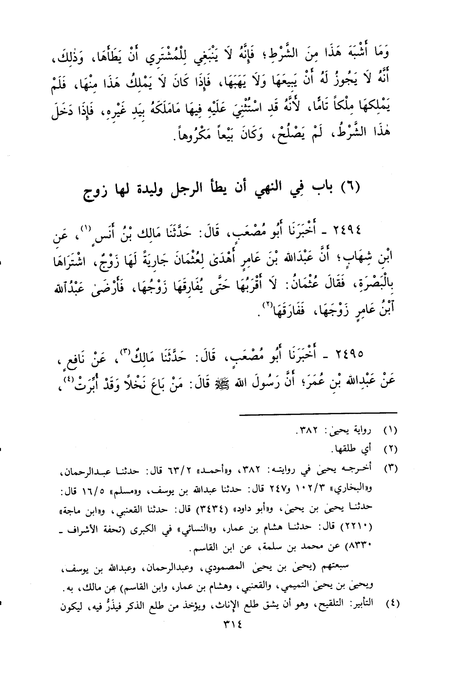 ٢٤٩٤ - أَخْبَرَنَا أَبُو مُصْعَبٍ، قَالَ: حَدَّثَنَا مَالِكٌ بن أنس، عَنِ ابْنِ شِهَابٍ، أَنَّ عَبْدَ اللهِ بْنَ عَامِرٍ أَهْدَى لِعُثْمَانَ جَارِيَةً، وَلَهَا زَوْجٌ، اشتراهَا بِالْبَصْرَةِ، فَقَالَ عُثْمَانُ: لَا أَقْرَبُهَا حَتَّى يُفَارِقَهَا زَوْجُهَا، فَأَرْضَى عبد الله بْنُ عَامِرٍ زَوْجَهَا , فَفَارَقَهَا.