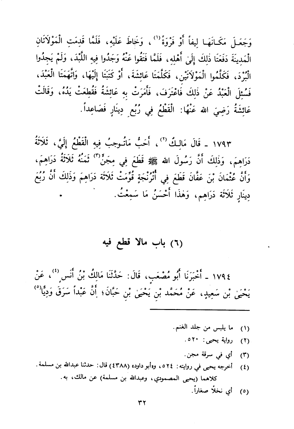 ١٧٩٤ - أَخْبَرَنَا أَبُو مُصْعَبٍ، قَالَ: حَدَّثَنَا مَالِكٌ بن أنس، عَنْ يَحْيَى بْنِ سَعِيدٍ، عَنْ مُحَمَّدِ بْنِ يَحْيَى بْنِ حَبَّانَ، أَنَّ عَبْدًا سَرَقَ وَدِيًّا مِنْ حَائِطِ رَجُلٍ فَغَرَسَهُ فِي حَائِطِ سَيِّدِهِ، فَخَرَجَ صَاحِبُ الْوَدِيِّ يَلْتَمِسُ وَدِيَّهُ، فوجده، فاستعدى على العبد مروان بن الحكم، فسجن العبد وأراد قطع يده، فانطلق صاحب العبد إلى رافع بن خديج، فسأله عَنْ ذَلِكَ، فَأَخْبَرَهُ، أَنَّهُ سَمِعَ رَسُولَ اللَّهِ صَلَّى اللَّهُ عَلَيْهِ وَسَلَمَ، يَقُولُ: لا قَطْعَ فِي ثَمَرٍ وَلَا كَثَرٍ، وَالْكَثَرُ الْجُمَّارُ فَقَالَ الرَّجُلُ: فَإِنَّ مَرْوَانَ بْنَ الْحَكَمِ أَخَذَ غُلَامًا لِي وَهُوَ يُرِيدُ قَطْعَ يده، وَأَنَا أُحِبُّ أَنْ تَمْشِيَ مَعِيَ إِلَيْهِ فَتُخْبِرَهُ بِالَّذِي سَمِعْتَ مِنْ رَسُولِ اللَّهِ صَلَّى اللَّهُ عَلَيْهِ وَسَلَمَ، فَمَشَى مَعَهُ رَافِعٌ بن خديج حتى أتيا مَرْوَانَ بْنِ الْحَكَمِ، فَقَالَ: أَخَذْتَ غُلَامًا لِهَذَا؟ فَقَالَ: نَعَمْ قَالَ: فَمَا أَنْتَ صَانِعٌ بِهِ؟ قَالَ: أَرَدْتُ قَطْعَ يَدِهِ فَقَالَ لَهُ رَافِعٌ بن خديج: سَمِعْتُ رَسُولَ اللَّهِ صَلَّى اللَّهُ عَلَيْهِ وَسَلَمَ، يَقُولُ: لا قَطْعَ فِي ثَمَرٍمعلق وَلَا في كَثَرٍ، فَأَمَرَ مَرْوَانُ بِالْعَبْدِ، فَأُرْسِلَ.
