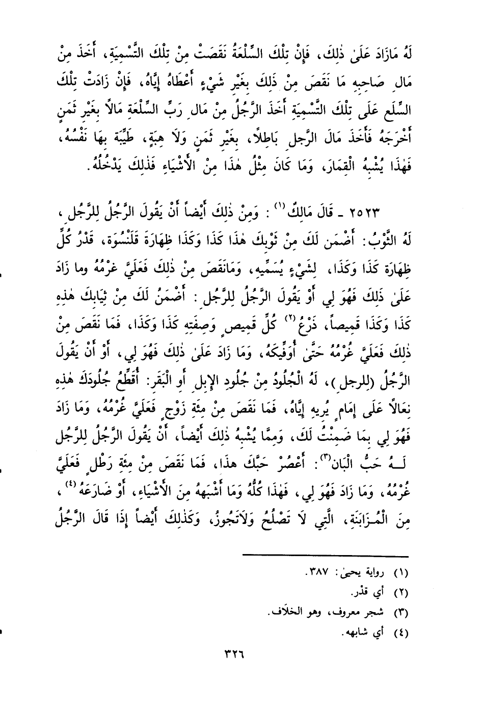 ٢٥٢٣ - قَالَ مَالِكٌ: وَمِنْ ذَلِكَ أَيْضًا: أَنْ يَقُولَ الرَّجُلُ لِلرَّجُلِ: لَهُ الثَّوْبُ أَضْمَنُ لَكَ مِنْ ثَوْبِكَ هَذَا كَذَا وَكَذَا ظِهَارَةَ قَلَنْسُوَةٍ، قَدْرُ كُلِّ ظِهَارَةٍ كَذَا وَكَذَا، لِشَيْءٍ يُسَمِّيهِ، ومَا نَقَصَ مِنْ ذَلِكَ , فَعَلَيَّ غُرْمُهُ، وَمَا زَادَ على ذلك فَهو لِي، أَوْ يَقُولَ الرَّجُلُ لِلرَّجُلِ: أَضْمَنُ لَكَ مِنْ ثِيَابِكَ هَذِهِ كَذَا وَكَذَا قَمِيصًا، ذَرْعُ كُلِّ قَمِيصٍ وصفته كَذَا وَكَذَا، فَمَا نَقَصَ مِنْ ذَلِكَ , فَعَلَيَّ غُرْمُهُ، حتى أوفكه وَمَا زَادَ عَلَى ذَلِكَ فَهو لِي، أَوْ أَنْ يَقُولَ الرَّجُلُ لِلرَّجُلِ لَهُ الْجُلُودُ مِنْ جُلُودِ الإِبِلِ أَوِ الْبَقَرِ: أُقَطِّعُ جُلُودَكَ هَذِهِ نِعَالاً عَلَى إِمَامٍ يُرِيهِ إِيَّاهُ، فَمَا نَقَصَ مِنْ مِائَةِ زَوْجٍ , فَعَلَيَّ غُرْمُهُ، وَمَا زَادَ فَهُوَ لِي بِمَا ضَمِنْتُ لَكَ، وَمِمَّا يُشْبِهُ ذَلِكَ، أَنْ يَقُولَ الرَّجُلُ لِلرَّجُلِ له حَبُّ الْبَانِ: اعْصُرْ حَبَّكَ هَذَا، فَمَا نَقَصَ مِنْ مئة رِطْل، فَعَلَيَّ غر مه، وَمَا زَادَ فَهُوَ لِي، فَهَذَا كُلُّهُ وَمَا أَشْبَهَهُ مِنَ الأََشْيَاءِ أَوْ ضَارَعَهُ مِنَ الْمُزَابَنَةِ الَّتِي لَا تَصْلُحُ وَلَا تَجُوزُ، وَكَذَلِكَ أَيْضًا إِذَا قَالَ الرَّجُلُ لِلرَّجُلِ لَهُ الْخَبَطُ وِ النَّوَى أَوِ الْعُصْفُرُ أَوِ الْكُرْسُفُ أَوِ الْكَتَّانُ أَوِ الْقَصبُ: أَبْتَاعُ مِنْكَ هَذَا الْخَبَطَ بِكَذَا وَكَذَا صَاعًا مِنْ خَبَطٍ مِثْلَ خَبَطِهِ، وهَذَا النَوًى بِكَذَا وَكَذَا صَاعًا مِنْ نَوًى مِثْلِهِ، وَالْعُصْفُرِمِثْلَ ذَلِكَ وَالْكُرْسُفِ، وَالْكَتَّانِ وَالْقَصبِ أيضاً مثل ذلك , فَهَذَا كُلُّهُ يَرْجِعُ إِلَى مَا وَصَفْنَا مِنَ الْمُزَابَنَةِ.