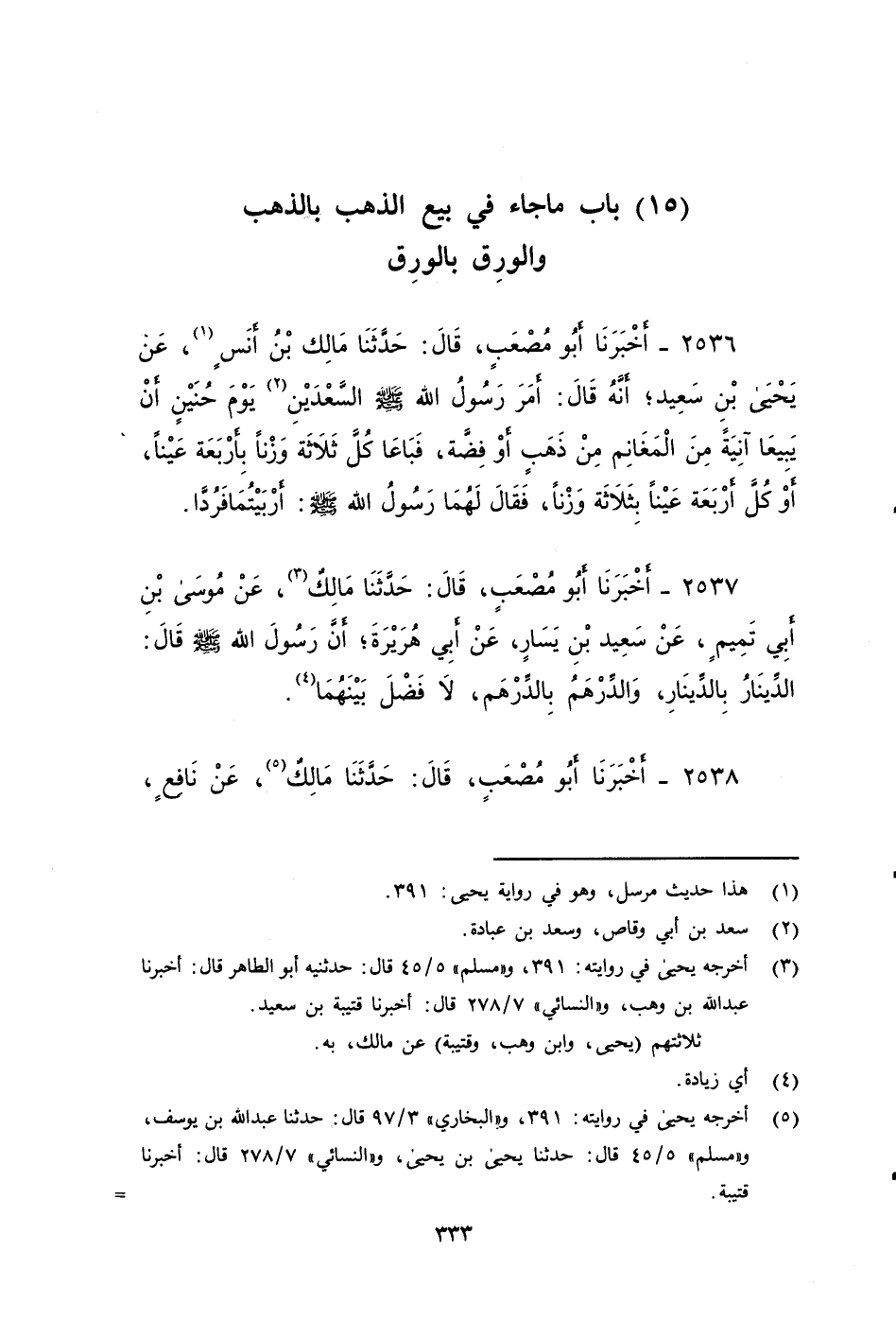 ٢٥٣٦ - أَخْبَرَنَا أَبُو مُصْعَبٍ، قَالَ: حَدَّثَنَا مَالِكٌ بن أنس، عَنْ يَحْيَى بْنِ سَعِيدٍ، أَنَّهُ قَالَ: أَمَرَ رَسُولُ اللَّهِ صَلى الله عَلَيه وَسَلم السَّعْدَيْنِ يوم حنين أَنْ يَبِيعَا آنِيَةً مِنَ الْمَغَانِمِ مِنْ ذَهَبٍ أَوْ فِضَّةٍ، فَبَاعَا كُلَّ ثَلَاثَةٍ وزنًا بِأَرْبَعَةٍ عَيْنًا، أَوْ كُلَّ أَرْبَعَةٍ عينًا بِثَلَاثَةٍ وزنًا فَقَالَ لَهُمَا رَسُولُ اللَّهِ صَلى الله عَلَيه وَسَلم: أَرْبَيْتُمَا فَرُدَّا.