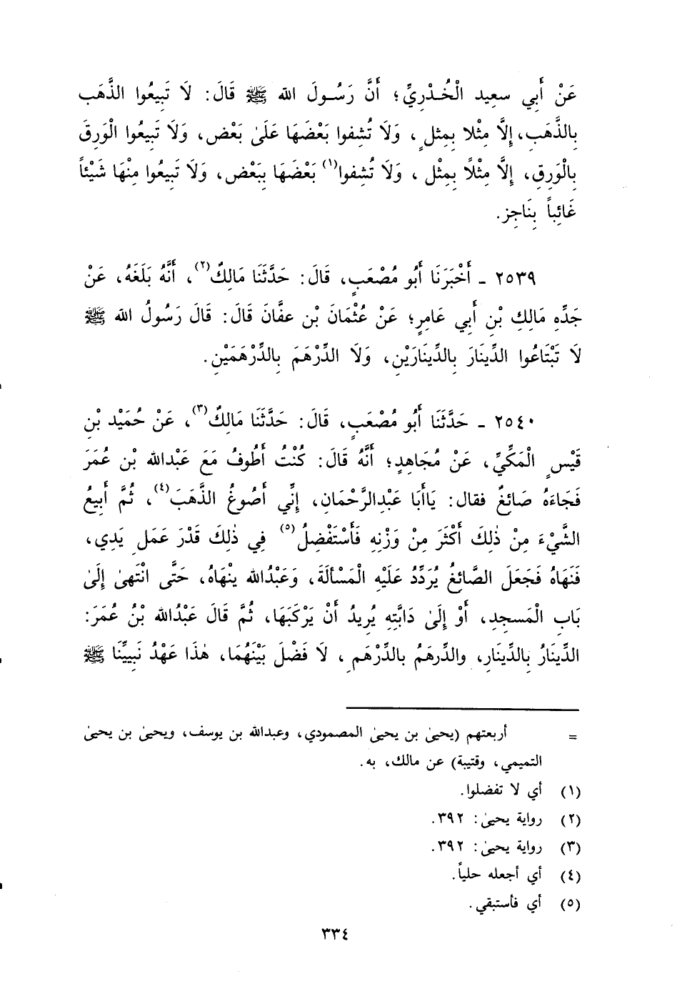 ٢٥٤٠ - حدثنا أَبُو مُصْعَبٍ، قَالَ: حَدَّثَنَا مَالِكٌ، عَنْ حُمَيْدِ بْنِ قَيْسٍ الْمَكِّيِّ، عَنْ مُجَاهِدٍ، أَنَّهُ قَالَ: كُنْتُ أطوف مَعَ عبد الله بن عمر، فَجَاءَهُ صَائِغٌ، فَقَالَ: يَا أَبَا عَبْدِ الرَّحْمَنِ، إِنِّي أَصُوغُ الذَّهَبَ ثُمَّ أَبِيعُ الشَّيْءَ مِنْ ذَلِكَ أَكْثَرَ مِنْ وَزْنِهِ فَأَسْتَفْضِلُ في ذَلِكَ قَدْرَ عَمَلِ يَدِي، فَنَهَاهُ، فَجَعَلَ الصَّائِغُ يُرَدِّدُ عَلَيْهِ الْمَسْأَلَةَ، وَعَبْدُ اللَّهِ يَنْهَاهُ، حَتَّى انْتَهَى إِلَى بَابِ الْمَسْجِدِ أَوْ إِلَى دابته يُرِيدُ أَنْ يَرْكَبَهَا، ثُمَّ قَالَ عَبْدُ اللَّهِ بْنُ عُمَرَ: الدِّينَارُ بِالدِّينَارِ، وَالدِّرْهَمُ بِالدِّرْهَمِ، لا فَضْلَ بَيْنَهُمَا، هَذَا عَهْدُ نَبِيِّنَا صَلى الله عَلَيه وَسَلم إِلَيْنَا وَعَهْدُنَا إِلَيْكُمْ.