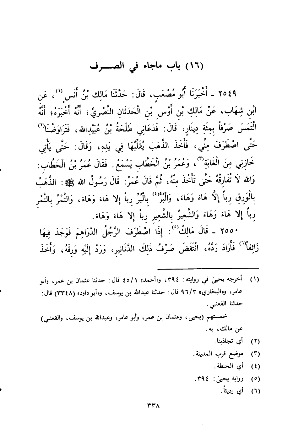 ٢٥٤٩ - أَخْبَرَنَا أَبُو مُصْعَبٍ، قَالَ: حَدَّثَنَا مَالِكٌ بن أنس، عَنِ ابْنِ شِهَابٍ، عَنْ مَالِكِ بْنِ أَوْسِ بْنِ الْحَدَثَانِ النَّصْرِيِّ أنه أخبره، أَنَّهُ الْتَمَسَ صَرْفًا بِمِائَةِ دِينَارٍ، قَالَ: فَدَعَانِي طَلْحَةُ بْنُ عُبَيْدِ اللَّهِ فَتَرَاوَضْنَا حَتَّى اصْطَرَفَ مِنِّي فأَخَذَ الذَّهَبَ يُقَلِّبُهَا فِي يَدِهِ، وقَالَ: حَتَّى يَأْتِيَ خَازِنِي مِنْ الْغَابَةِ وَعُمَرُ بْنُ الْخَطَّابِ يَسْمَعُ، فَقَالَ عُمَرُ: وَاللَّهِ لا تُفَارِقْهُ حَتَّى تَأْخُذَ مِنْهُ ثُمَّ قَالَ عمر: قَالَ رَسُولُ اللَّهِ صَلى الله عَلَيه وَسَلم: الذَّهَبُ بِالْوَرِقِ رِبًا إِلَّا هَاءَ وَهَاءَ، وَالْبُرُّ بِالْبُرِّ رِبًا إِلَّا هَاءَ وَهَاءَ، وَالتَّمْرُ بِالتَّمْرِ رِبًا إِلَّا هَاءَ وَهَاءَ، وَالشَّعِيرُ بِالشَّعِيرِ رِبًا إِلَّا هَاءَ وَهَاءَ.