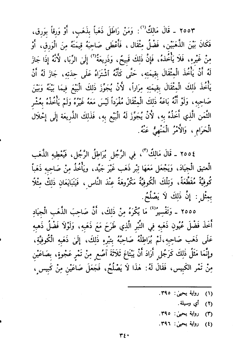 ٢٥٥٣ - قَالَ مَالِكٌ: ومَنْ رَاطَلَ ذَهَبًا بِذَهَبٍ، أَوْ وَرِقًا بِوَرِقٍ، فَكَانَ بَيْنَ الذَّهَبَيْنِ فَضْلُ مِثْقَالٍ، فَأَعْطَى صَاحِبَهُ قِيمَتَهُ مِنَ الْوَرِقِ أَوْ مِنْ غَيْرِهَ، فَلَا يَأْخُذُهُ، فَإِنَّ ذَلِكَ قَبِيحٌ، وَذَرِيعَةٌ إِلَى الرِّبَا، لأَنَّهُ إِذَا جَازَ لَهُ أَنْ يَأْخُذَ الْمِثْقَالَ بِقِيمَتِهِ، حَتَّى كَأَنَّهُ اشْتَرَاهُ عَلَى حِدَتِهِ، جَازَ لَهُ أَنْ يَأْخُذَ ذلك الْمِثْقَالَ بِقِيمَتِهِ مِرَارًا، لأَنْ يُجِوزَ ذَلِكَ الْبَيْعَ فيما بَيْنَهُ وَبَيْنَ صَاحِبِهِ، وَلَوْ أَنَّهُ بَاعَهُ ذَلِكَ الْمِثْقَالَ مُفْرَدًا، لَيْسَ مَعَهُ غَيْرُهُ ولَمْ يَأْخُذْهُ بِعُشْرِ الثَّمَنِ الَّذِي أَخَذَهُ بِهِ، لأَنْه يُجَوِّزَ لَهُ الْبَيْعَ به، فَذَلِكَ الذَّرِيعَةُ إِلَى إِحْلَالِ الْحَرَامِ، وَالأََمْرُ الْمَنْهِيُّ عَنْهُ.