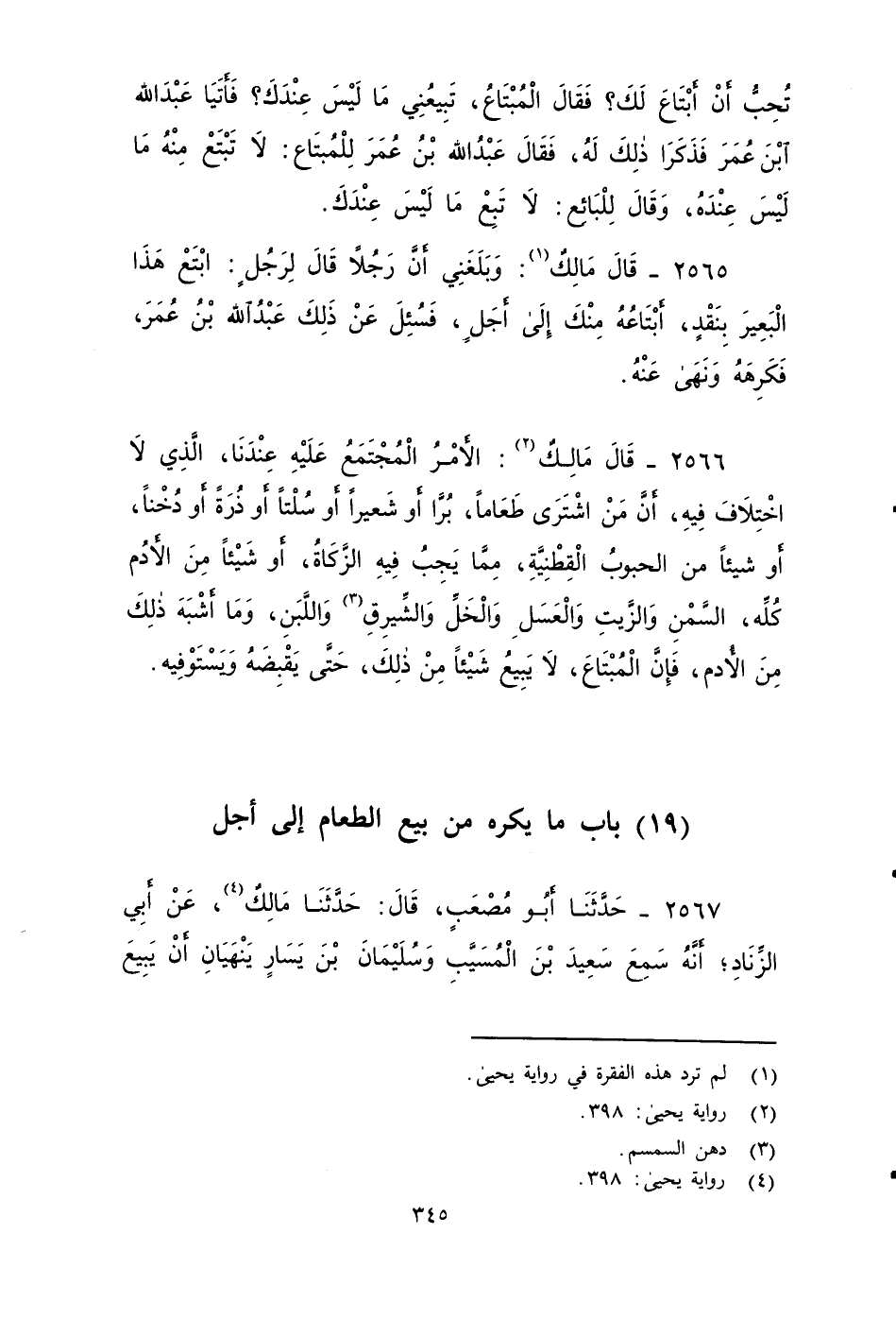 ٢٥٦٦ - قَالَ مَالِكٌ: الأََمْرُ الْمُجْتَمَعُ عَلَيْهِ عِنْدَنَا، الَّذِي لَا اخْتِلَافَ فِيهِ: أَنَّ مَنِ اشْتَرَى طَعَامًا بُرًّا أَوْ شَعِيرًا، أَوْ سُلْتًا أَوْ ذُرَةً، أَوْ دُخْنًا أَوْ شَيْئًا مِنَ الْحُبُوبِ الْقِطْنِيَّةِ، مِمَّا يجِبُ فِيهِ الزَّكَاةُ أَوْ شَيْئًا مِنَ الأَُدُمِ كُلِّهَا: السَّمْنِ , وَالزَّيْتِ , وَالْعَسَلِ، وَالْخَلِّ , وَالشِّيرَقِ، وَاللَّبَنِ , وَمَا أَشْبَهَ ذَلِكَ مِنَ الأَُدْمِ، فَإِنَّ الْمُبْتَاعَ لَا يَبِيعُ شَيْئًا مِنْ ذَلِكَ، حَتَّى يَقْبِضَهُ وَيَسْتَوْفِيَهُ.
