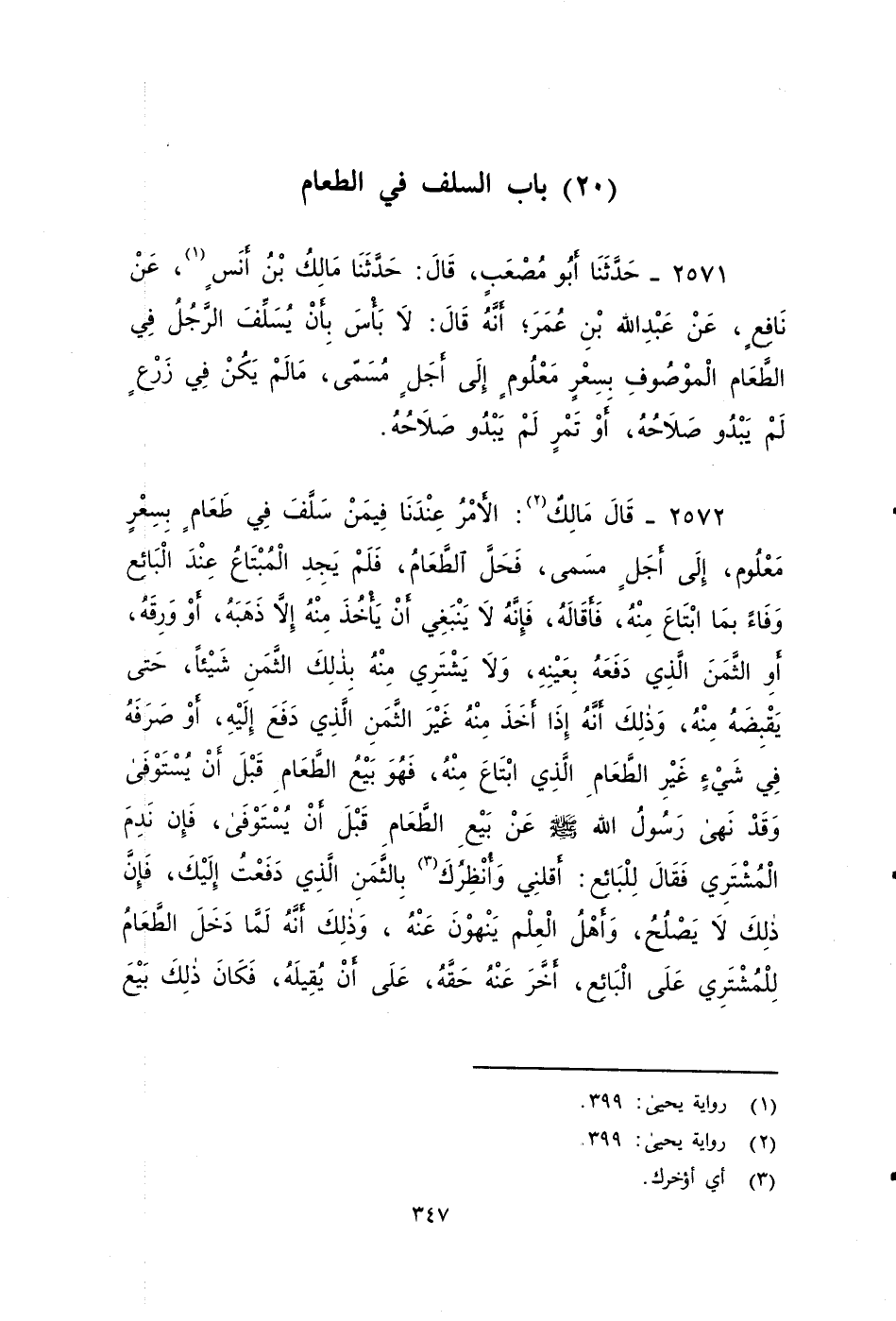 ٢٥٧١ - حدثنَا أَبُو مُصْعَبٍ، قَالَ: حَدَّثَنَا مَالِكٌ بن أنس، عَنْ نَافِعٍ، عَنْ عَبْدِ اللهِ بْنِ عُمَرَ؛ أَنَّهُ قَالَ: لَا بَأْسَ بِأَنْ يُسَلِّفَ الرَّجُلُ الرَّجُلَ فِي الطَّعَامِ الْمَوْصُوفِ بِسِعْرٍ مَعْلُومٍ إِلَى أَجَلٍ مُسَمًّى، مَا لَمْ يَكُنْ فِي زَرْعٍ لَمْ يَبْدُو صَلَاحُهُ، أَوْ تَمْرٍ لَمْ يَبْدُو صَلَاحُهُ.