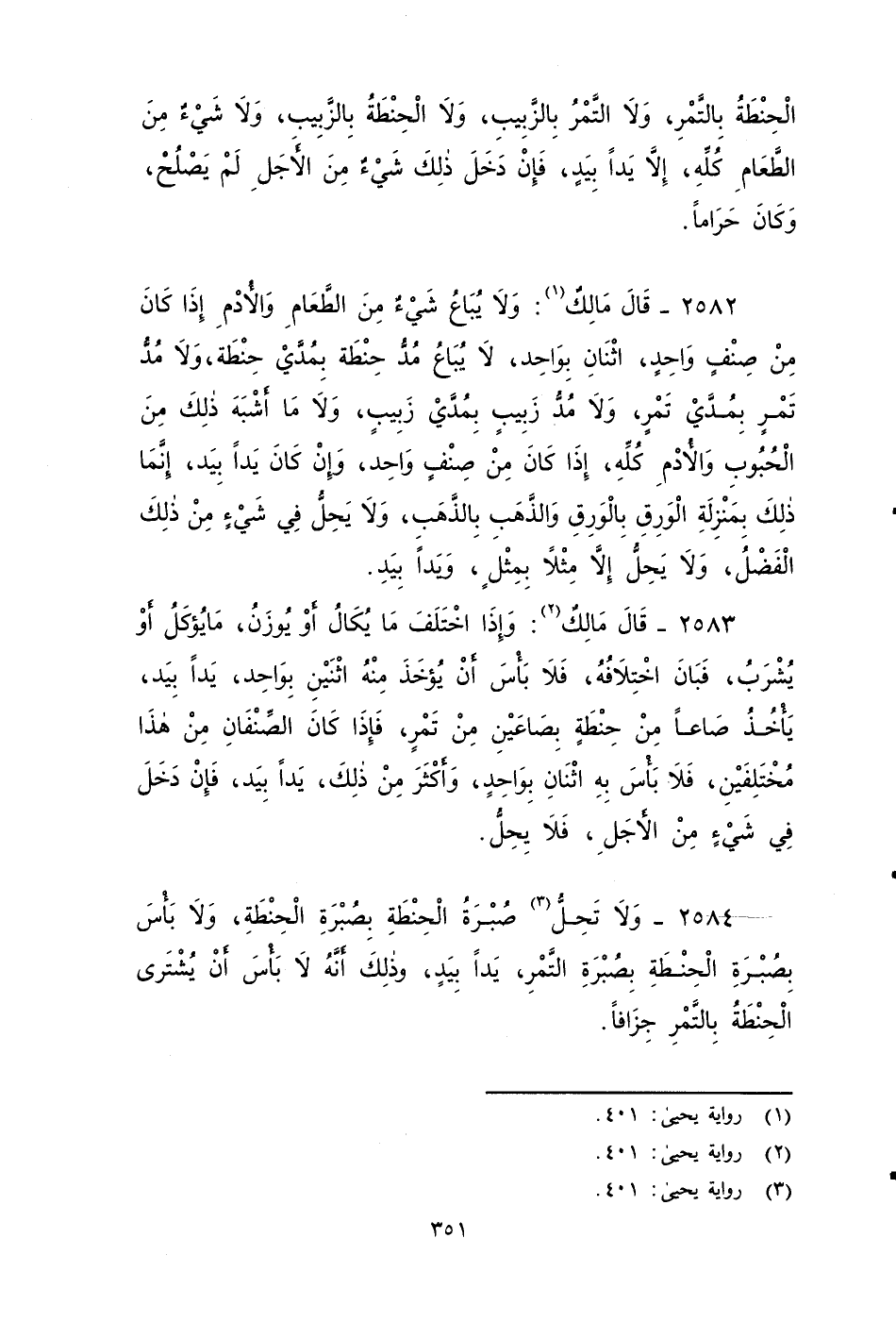 ٢٥٨٢ - قَالَ مَالِكٌ: وَلَا يُبَاعُ شَيْءٌ مِنَ الطَّعَامِ وَالأَُدْمِ، إِذَا كَانَ مِنْ صِنْفٍ وَاحِدٍ: اثْنَانِ بِوَاحِدٍ، لَا يُبَاعُ مُدُّ حِنْطَةٍ بِمُدَّيْ حِنْطَةٍ، وَلَا مُدُّ تَمْرٍ بِمُدَّيْ تَمْرٍ، وَلَا مُدُّ زَبِيبٍ بِمُدَّيْ زَبِيبٍ، وَلَا مَا أَشْبَهَ ذَلِكَ مِنَ الْحُبُوبِ وَالأَُدْمِ كُلِّهَ، إِذَا كَانَ مِنْ صِنْفٍ وَاحِدٍ، وَإِنْ كَانَ يَدًا بِيَدٍ، إِنَّمَا ذَلِكَ بِمَنْزِلَةِ الْوَرِقِ بِالْوَرِقِ، وَالذَّهَبِ بِالذَّهَبِ , وَلَا يَحِلُّ فِي شَيْءٍ مِنْ ذَلِكَ الْفَضْلُ، وَلَا يَحِلُّ إِلَاّ مِثْلاً بِمِثْلٍ وَيَدًا بِيَدٍ.