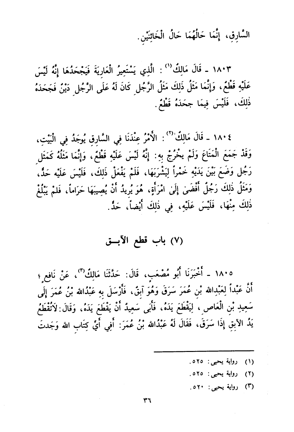 ١٨٠٥ - أَخْبَرَنَا أَبُو مُصْعَبٍ، قَالَ: حَدَّثَنَا مَالِكٌ، عَنْ نَافِعٍ، أَنَّ عَبْدًا لِعَبْدِ اللهِ بْنِ عُمَرَ سَرَقَ وَهُوَ آبِقٌ , فَأَرْسَلَ بِهِ عَبْدُ اللهِ بْنُ عُمَرَ إِلَى سَعِيدِ بْنِ الْعَاصِ، لِيَقْطَعَ يَدَهُ , فَأَبَى سَعِيدٌ أَنْ يَقْطَعَ يَدَهُ، وَقَالَ: لَا تُقْطَعُ يَدُ الآبِقِ إِذَا سَرَقَ، فَقَالَ لَهُ عَبْدُ اللهِ بْنُ عُمَرَ: أفِي أَيِّ كِتَابِ اللهِ وَجَدْتَ هَذَا؟ فأَمَرَ بِهِ عَبْدُ اللهِ بْنُ عُمَرَ , فَقُطِعَتْ يَدُهُ.