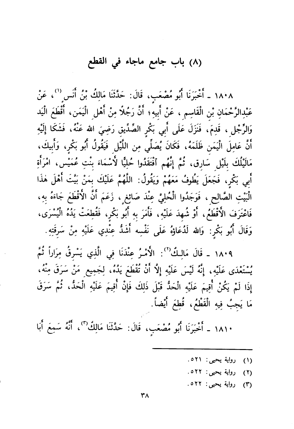 ١٨٠٩ - قَالَ مَالِكٌ: الأََمْرُ عِنْدَنَا فِي الَّذِي يَسْرِقُ مِرَارًا , ثُمَّ يُسْتَعْدَى عَلَيْهِ: إِنَّهُ لَيْسَ عَلَيْهِ إِلَاّ أَنْ تُقْطَعَ يَدُهُ لِجَمِيعِ مَنْ سَرَقَ مِنْهُ , إِذَا لَمْ يَكُنْ أُقِيمَ عَلَيْهِ الْحَدُّ قَبْلَ ذَلِكَ، فَإِنْ أُقِيمَ عَلَيْهِ الْحَدُّ، ثُمَّ سَرَقَ مَا يَجِبُ فِيهِ الْقَطْعُ، قُطِعَ أَيْضًا.